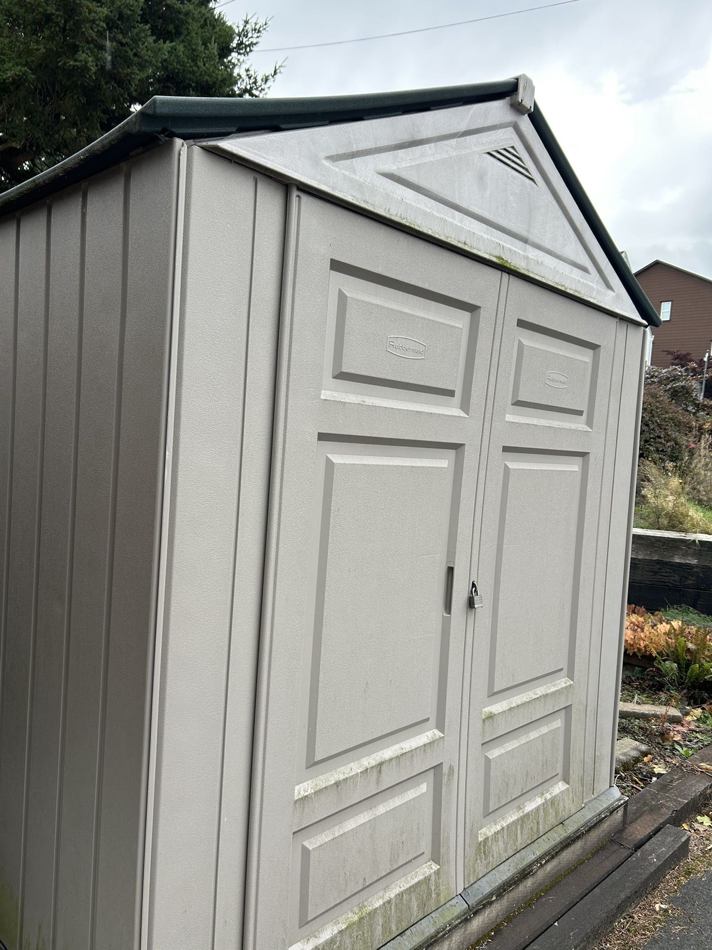Gray with green top Rubbermaid storage shed. 7ft wide by 7ft deep and 8ft tall at the highest point. Disassembled. Used but in good shape.