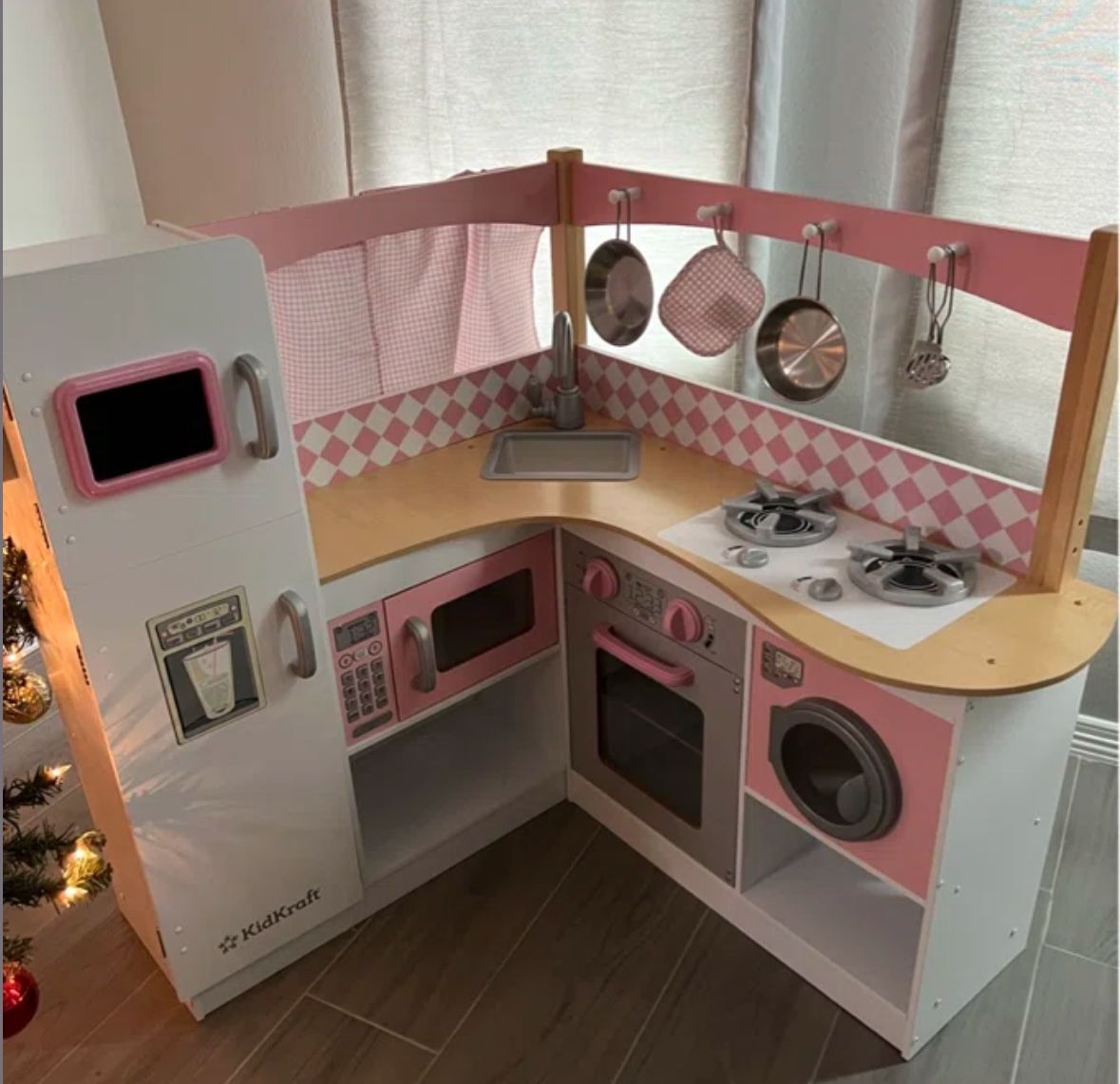 KidKraft wooden play kitchen. in very good condition. Has fabric curtains, metal utensils & kitchen phone on the side, working doors on washer, oven, microwave, refrigerator and freezer. Operable knobs on stove and faucet & Chalkboard on freezer door