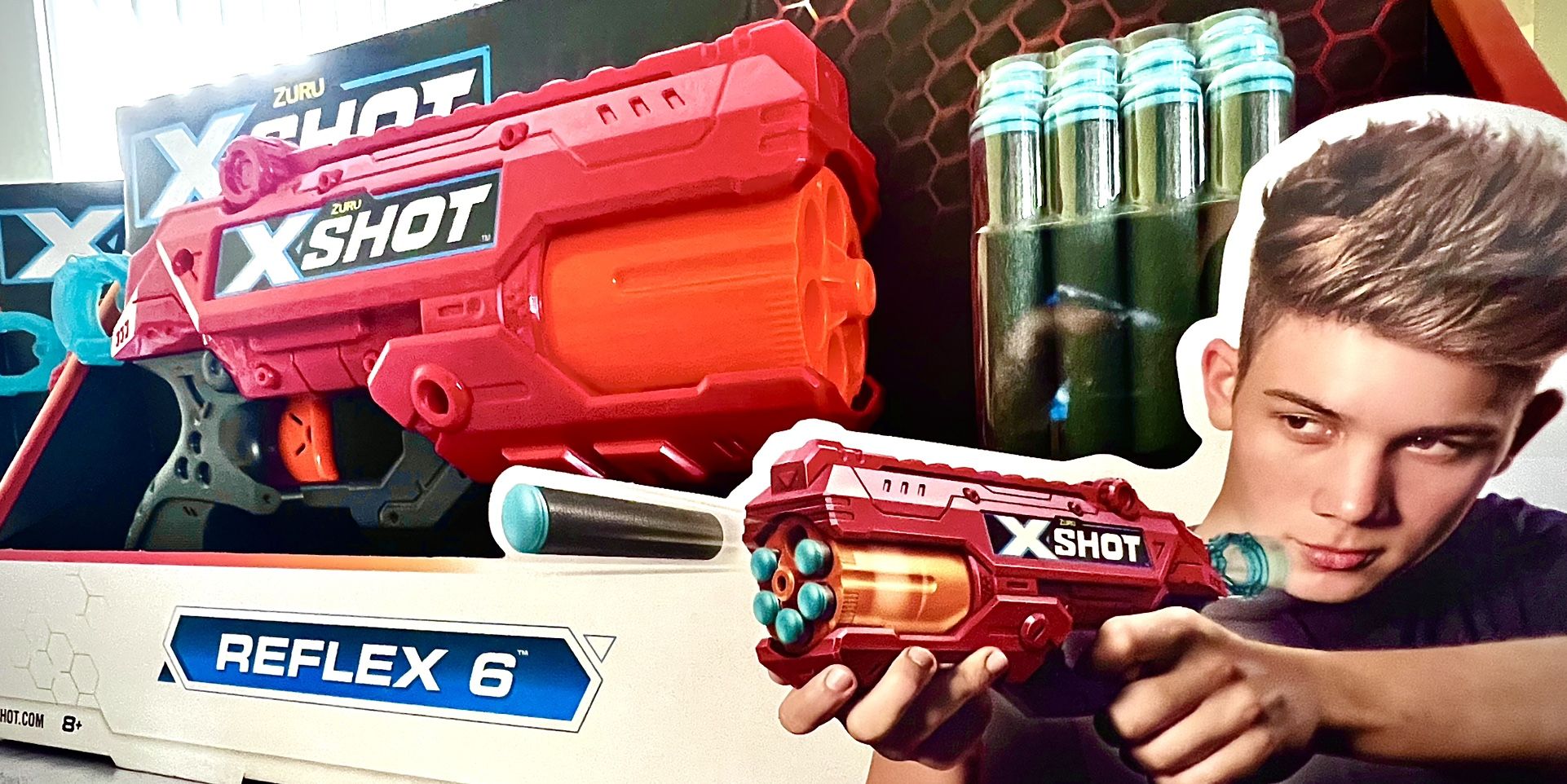 Reflex 6! Comes with 12 X shot bullets Reach 90 ft/27m Recommend age 8+