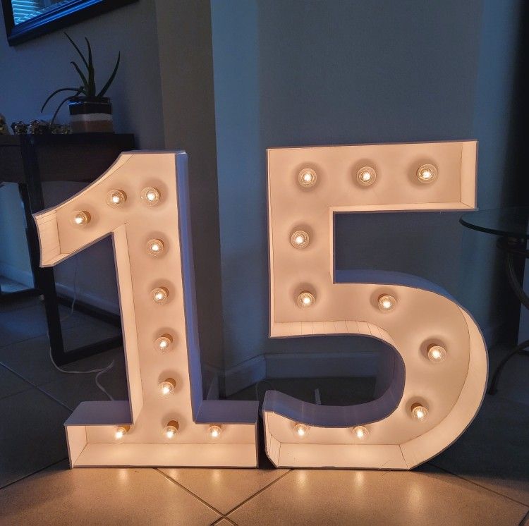 This sign is hand made fashioned by putting together posterboard pieces to make the number 15. Holes were drilled into the posterboard for the lights. Plug and play with interchangeable bulbs to white and yellow light.