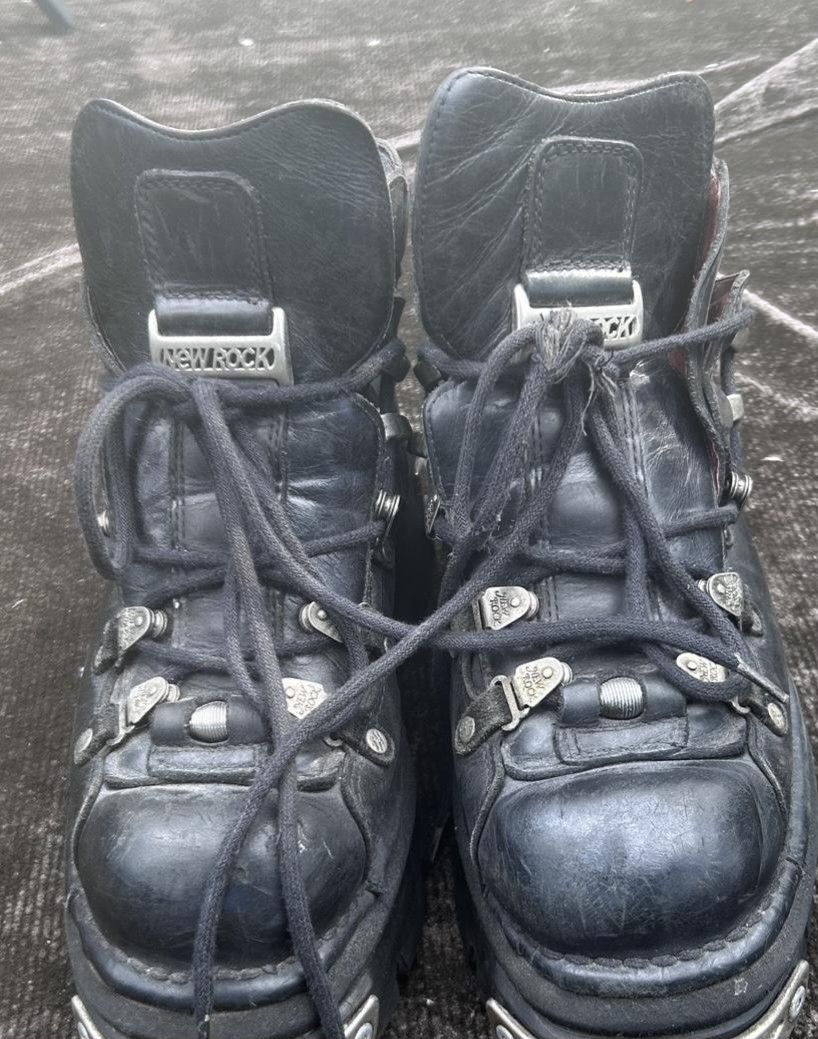 New Rock Reactor Size 9.5 - 10 Worn, but plenty of life left, hence the price. Back metal pieces missing, front left plate cracked and taped, and wear tear on inner heel. Laces are a bit shredded, but functional. Sole is completely intact, and recently resoled by cobbler. All pictured in photos. Local Pickup Only Cash / Venmo Only