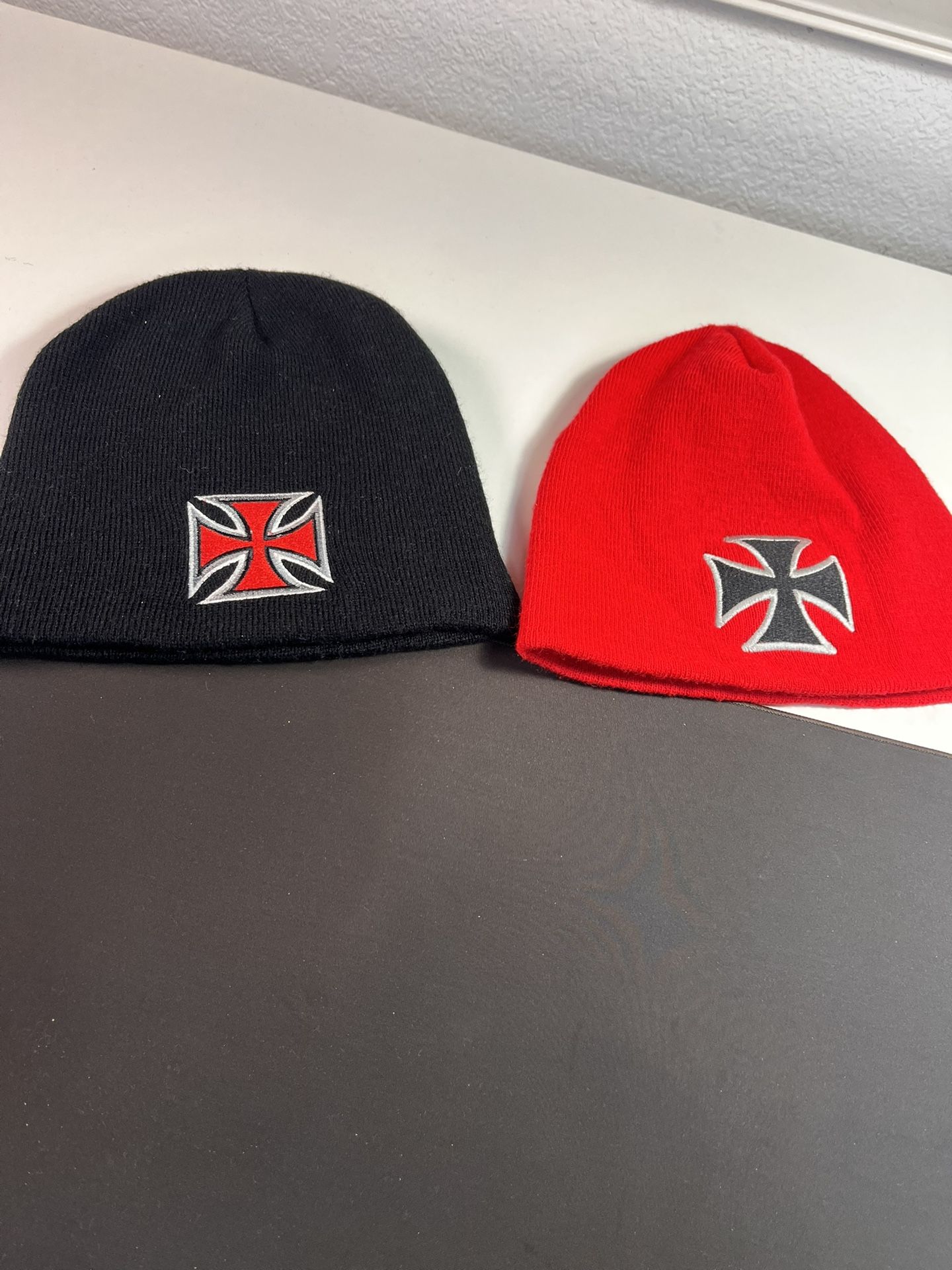 2 Biker Style Iron Cross Beanies Cap Red and black One Size