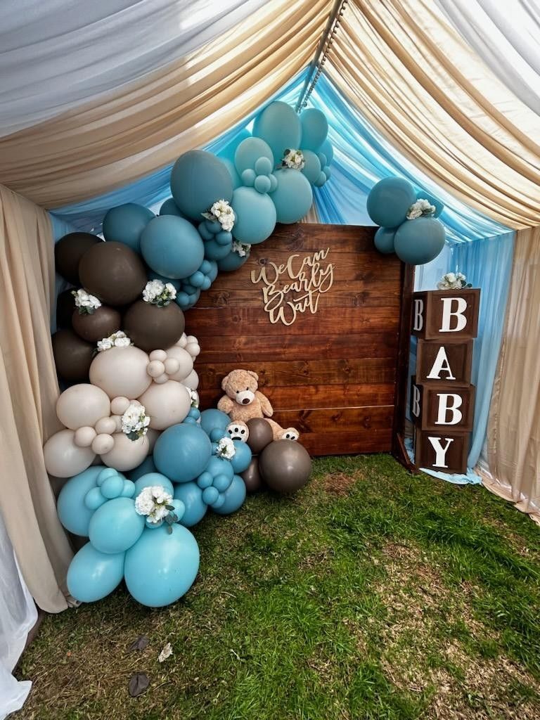 Tents Draping Balloon garlands Baby blocks Tables Chairs Table linen Table runners