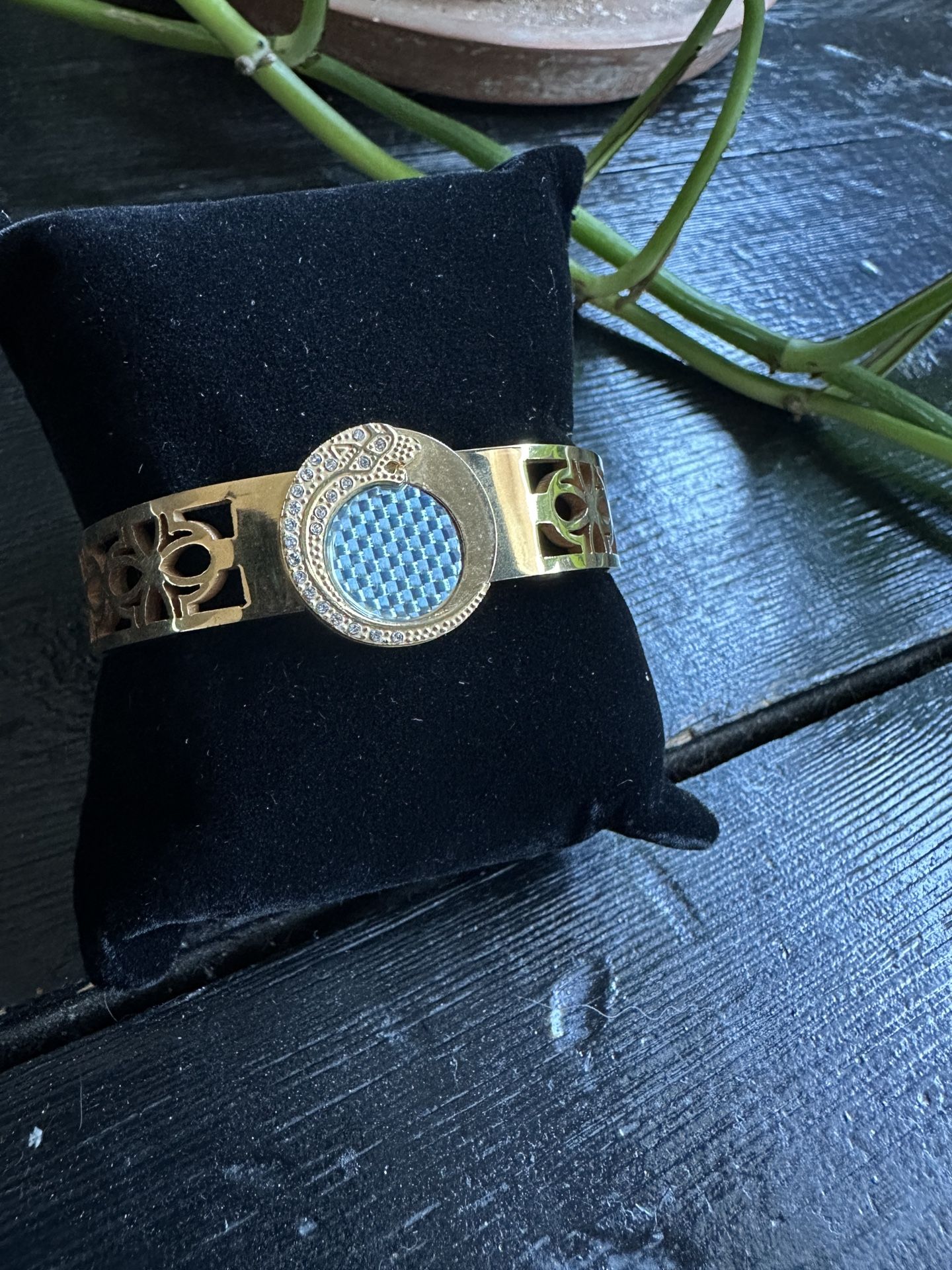 Gold bracelet with detail on cuff, circular blue and rhinestone pendant. 6 inches bendable cuff #goldcuff #blue #bracelet #goldjewelry