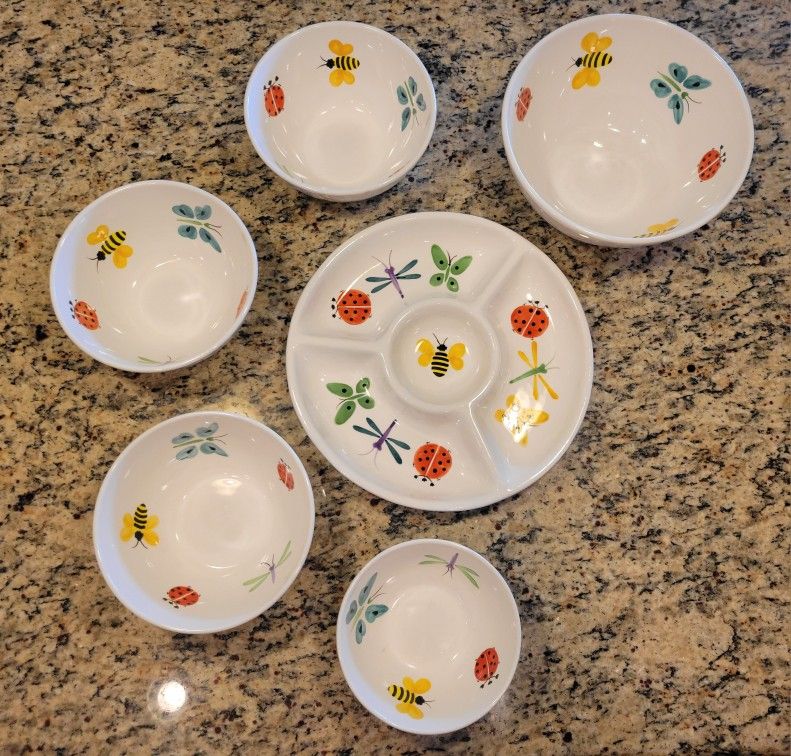 At Home International Frank Richmann Platter and Serving Bowls Platter is 13", has four compartments and a central dip bowl. Large bowl - 10.5" aprox 4Q Med bowl - 8" aprox 1.5Q Sm bowl - 7" aprox 1Q Ladybugs, butterflies, dragonflies, and a bumblebees.