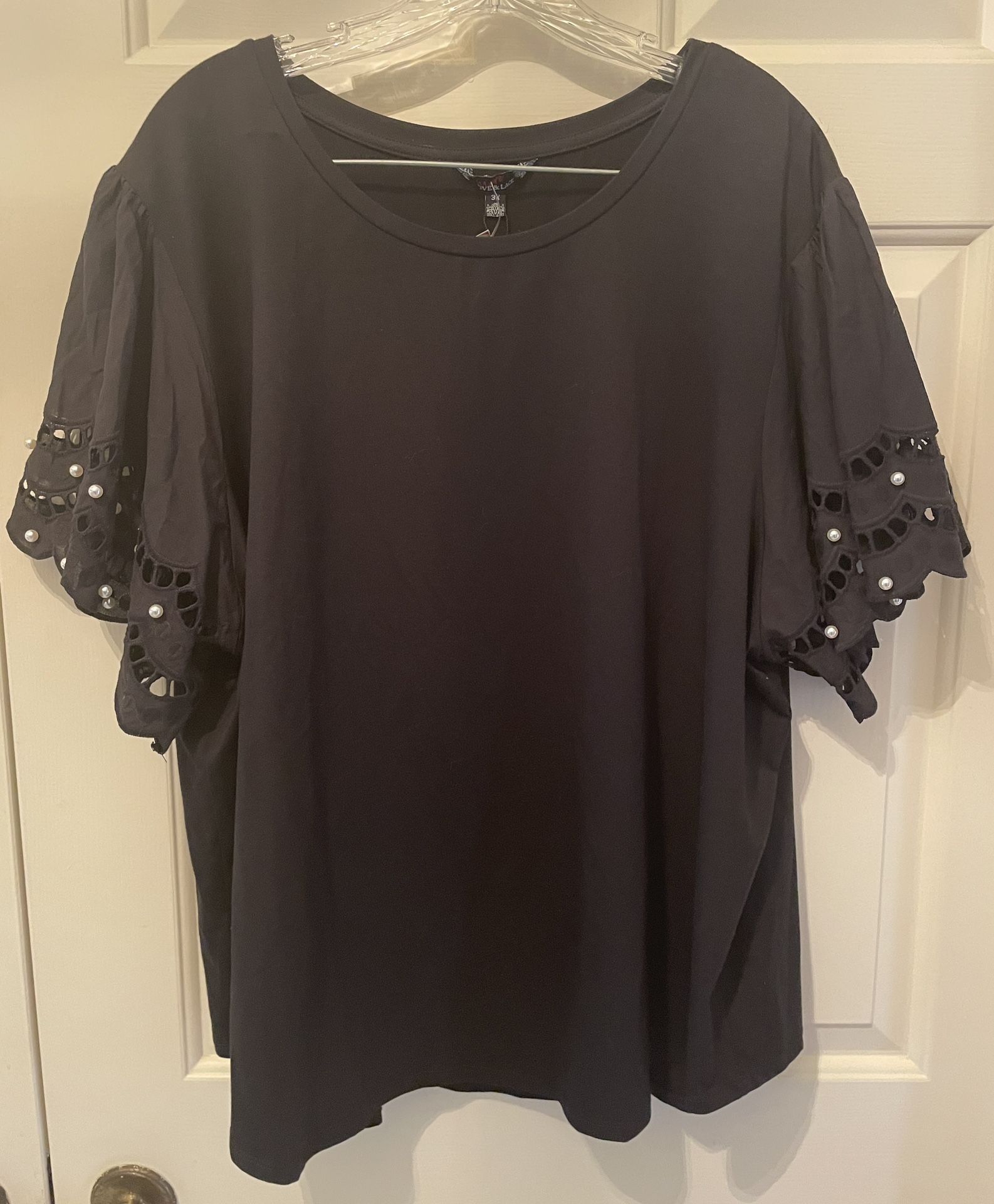 More Love & Lace Black Top 3x Eyelet Pearl Sleeve Cotton Blend NWT Brand: Love & More / Love & Lace Size: Women's 3X Condition: New with Tags (NWT) Color: Black Product Features: • Unique Sleeves: Dramatic puff/ flutter sleeves featuring intricate eyelet lace embroidery and faux pearl embellishments. • Comfortable Fabric: Soft jersey body made from a breathable cotton-rayon blend with a hint of spandex for stretch. • Versatile Style: Easy crew neck silhouette that pairs perfectly with jeans for a casual look or trousers for the office. • Care: Machine wash cold, line dry. Measured Flat (Approximate): • Pit to Pit: 25 inches • Length (Shoulder to Hem): 25.5 inches • Shoulder to Shoulder: 17.5 inches Sleeve 9.5