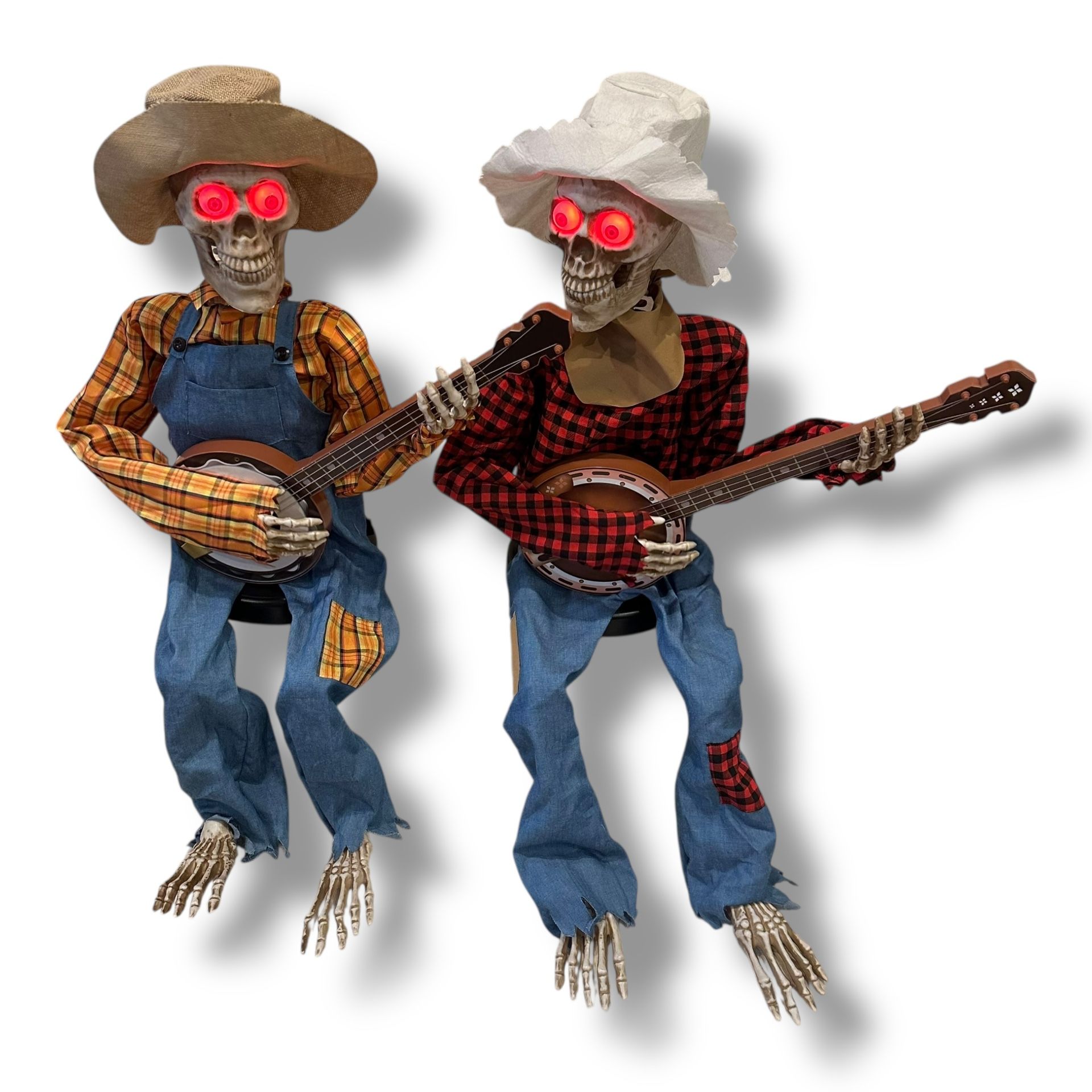 Dueling Banjo Skeletons Halloween Animated W/ Box #1486918 Costco excellent condition tested working See pictures. These dueling banjo skeletons are also multilingual and can be switched between English, Spanish, French and no language (just music) Description from Costco Product Details This member exclusive begins with some lighthearted banter. They play 3 songs, ‘Dueling Banjos’ ‘Hall of the Mountain King.’ And the ‘William Tell Overture’. They strum their unique banjos synchronized to the music, their heads turn and eyes light up. There are 4 language settings (English, French, Spanish, no language). There is a volume control knob. They activate with motion or sound sensors. Simply plug and play to begin the action Features: Animatronic motion with synchronized light up and head motion Multiple language selector knob Dual sensor operation Plug & Play no assembly or tools are required A/C adapter included Multiple language instruction manual included Includes: 2 Dressed molded skeletons holding banjos A/C Adapter Instruction manual Specifications: Dimensions (each) (L × W × H/D): 33 cm × 58 cm × 99 cm (13 in. × 23 in. × 39 in.) Weight (each): 3.3 kg (7.28lb.) Specifications- ColourMulti Cord Length167.64 cm (66 in.) FeaturesMotion Activated ModelGL(contact info removed) Power SourceElectric Weight3.3 kg (7.28 lb.)