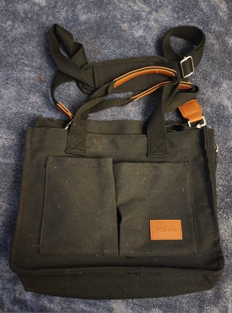 Practical black canvas bag. Has brown faux leather accents on handles and strap. Two front pockets. Comes with top handles and an adjustable shoulder strap. Klavicu brand. It's in great shape , no rips or tears