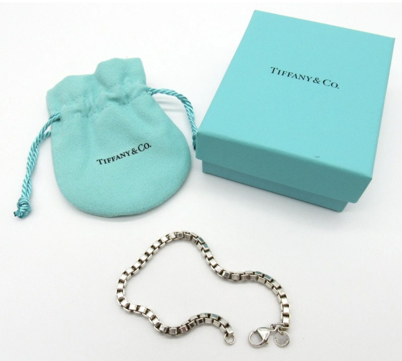 Tiffany & Co. Sterling Silver Venetian Box Link Bracelet 7.5” w/ Box & Pouch Condition: Pre-Owned – Very Good Authentic Tiffany & Co. Venetian (Box Link) Bracelet crafted in sterling silver (Ag 925). Classic, timeless design with secure lobster clasp and Tiffany tag charm. Includes original Tiffany & Co. blue box and pouch. Details Brand: Tiffany & Co. Style: Venetian / Box Link Bracelet Metal: Sterling Silver (Ag 925) Length: Approx. 7.5 inches (see measurement photo) Clasp: Lobster clasp Hallmarks: Tiffany & Co., Ag 925 Condition Notes Very good pre-owned condition Light surface scratches consistent with normal wear No dents or structural damage Clasp functions properly Professionally cleaned and ready to wear Please review all photos carefully as they are part of the description. Included Tiffany & Co. Bracelet Tiffany blue pouch Tiffany blue box A timeless and elegant piece perfect for everyday wear or gifting. Tiffany Venetian bracelets remain one of the brand’s most popular and collectible sterling silver designs.