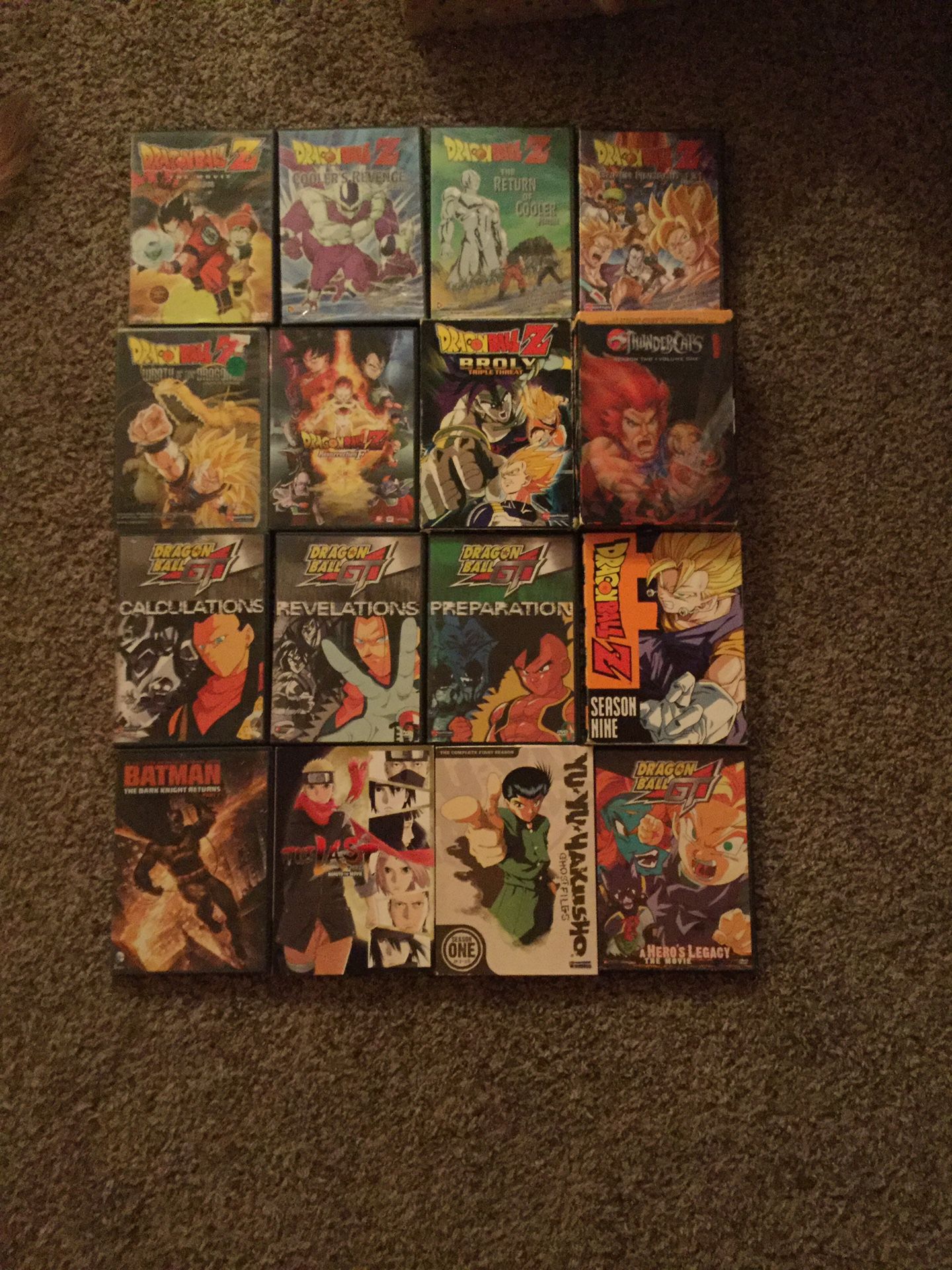 Just missing last 3 DBZ movies from original series but have the rest. Individual movies $10 The Broly collection $25 Batman 10 ThunderCats 20 NARUTO 10 Yu-Yu Hakusho 20