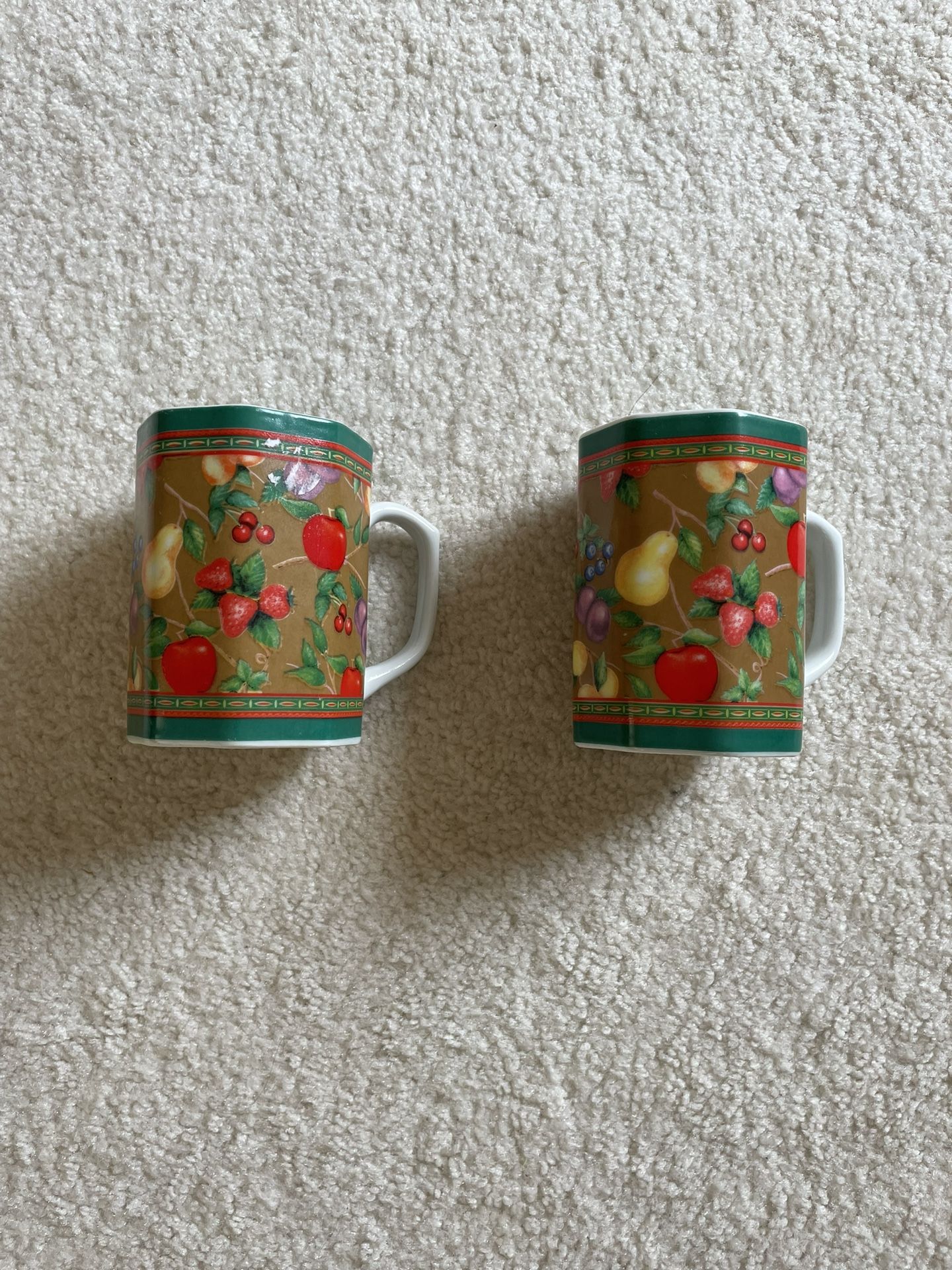 I have for sale a pair of used mugs. They are matching and have a design with fruits/berries. I am looking to sell both mugs to a single buyer. The price is for the pair together. Cash only (paper money) No forms of electronic payment All sales final
