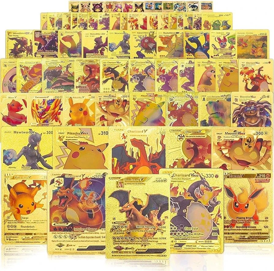 Ultra Rare 55 PCS Gold Packs Vmax V EX GX Rare Golden Cards TCG Deck Box Gold Foil Card for Fans/Kids/Collectors Gifts pokemon pic (No Duplicates)