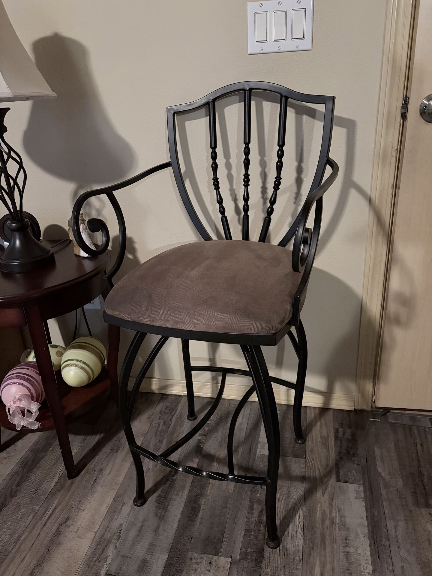 3 rod iron bar stools, black iron with a brown material seat. (I have 3 total) They are extremely sturdy! No rips, not broken, non smoking home. Must pick up in Lacey. 26” from floor to seat 16” square seat 39 1/2” total ht from floor to top of chair $25 each