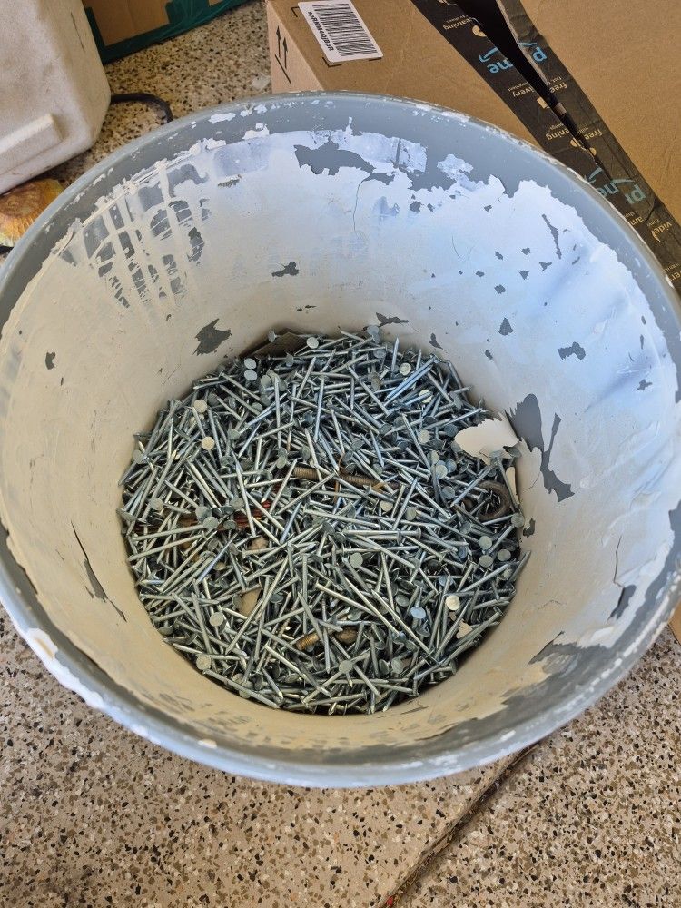 Almost half full 5 gallon bucket of nails and a bunch of screws 20 obo