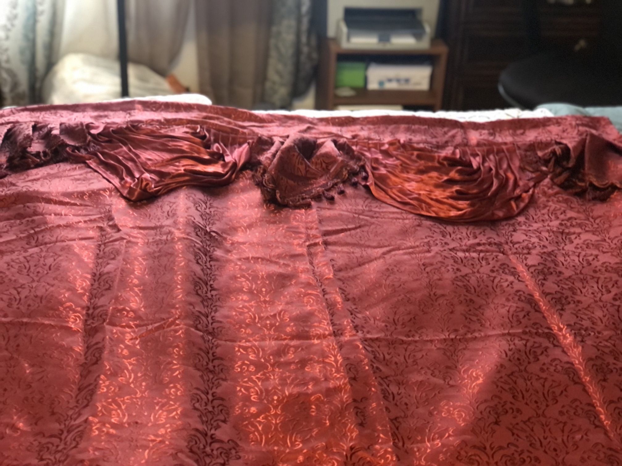 I have 4 panels or 2 sets of beautiful burgundy curtains with the matching pull backs. See the size of each curtain panel in pictures. I am asking 60.00 or best offer.