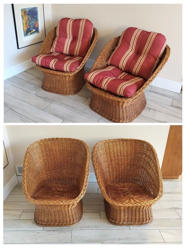 Pair of Vintage Rattan Barrel Pod Bucket Chairs With Cushions likely produced in the 1960s or 1970s.