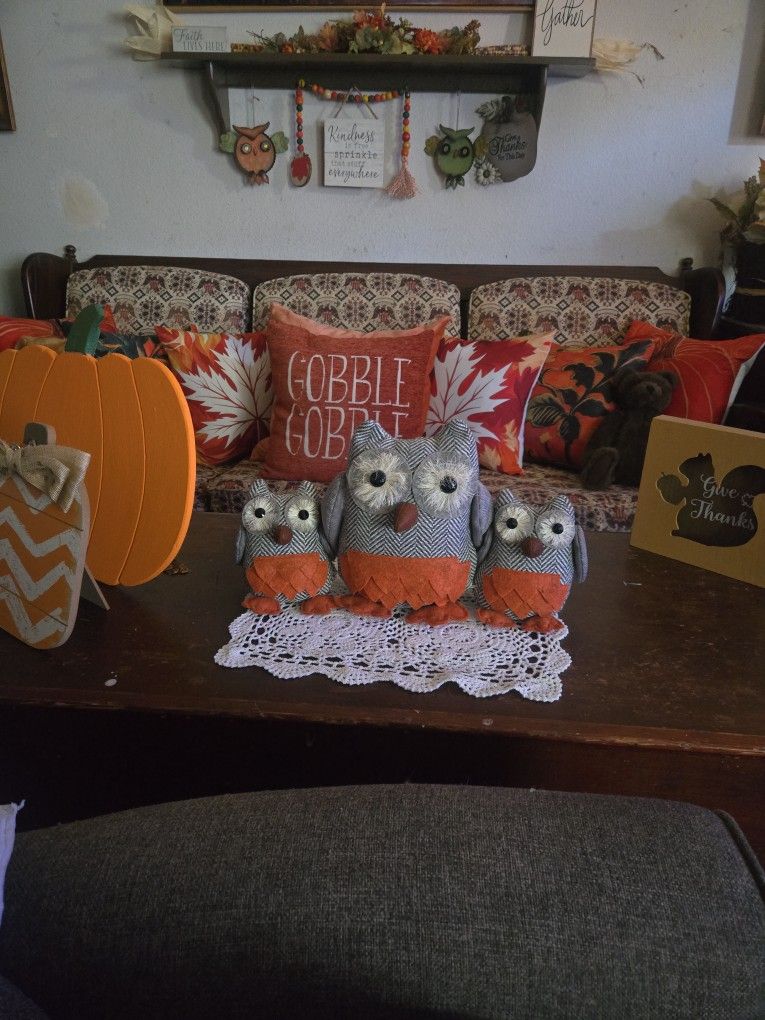 Cute Jointed 3 Fall Owls Decoration . In Good Condition . None Smoke Home