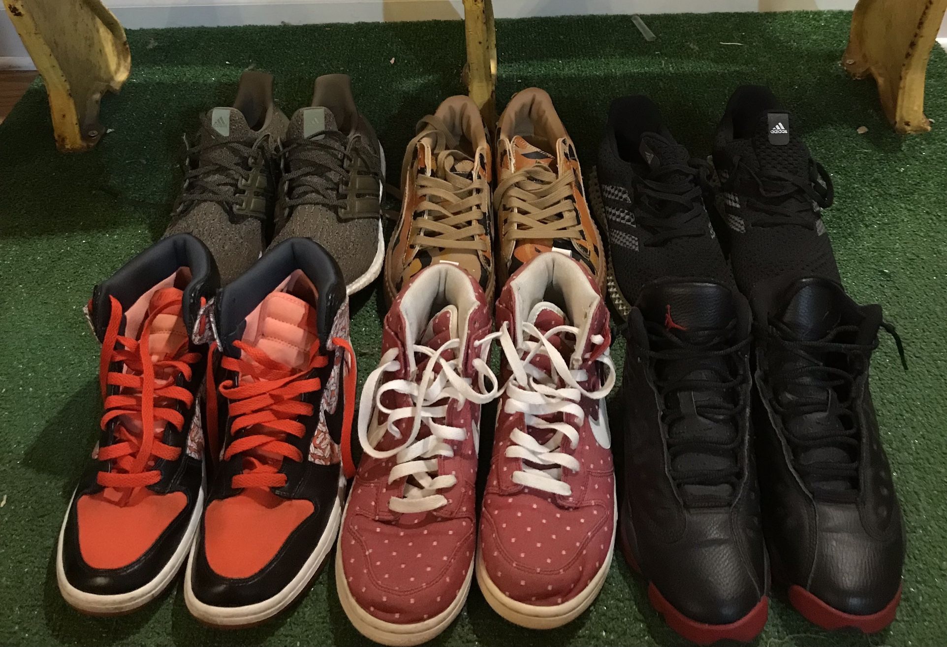 1) olive ultra boost-10.5 2( Rihanna fenty puma Ds nb 7.5 3) Adidas future craft-8.5 4)Nike dunk women’s skinny- 9 5) Nike dunk high picnic blacket-8 6)Jordan 13 -5y 7)what the Jordan 4-2.5y 8)Jordan 1 -2y 9)Jordan 5 aqua -1y 10)Jordan -5c 11)Nike fly knit -9.5 12)Jordan -5c 14Adidas Stan smith -5.5 Trying to sell as a lot