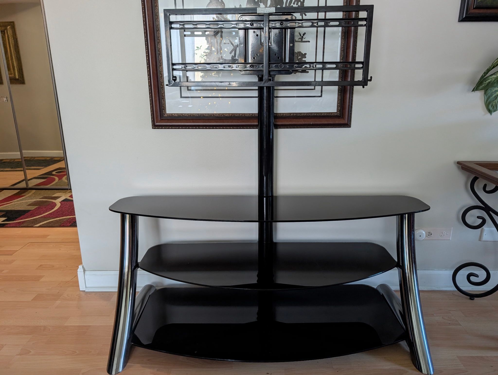 Sleek, modern TV stand featuring a black tempered glass design with a built-in TV mount. This is a sturdy, well-made piece that elevates any living room with a clean, contemporary look. Dimensions: • Width: 54 inches • Height: 54 inches (including mount) • Depth: 20 inches Features: • Integrated TV mounting system (great for a clean, streamlined setup) • Three-tier black tempered glass shelves • Ideal for cable box, streaming devices, gaming consoles, or soundbar • Chrome-finish curved legs for a modern, elegant aesthetic • Very solid and stable construction Condition: Gently used and in very good condition. No cracks or chips in the glass. Clean and well cared for.
