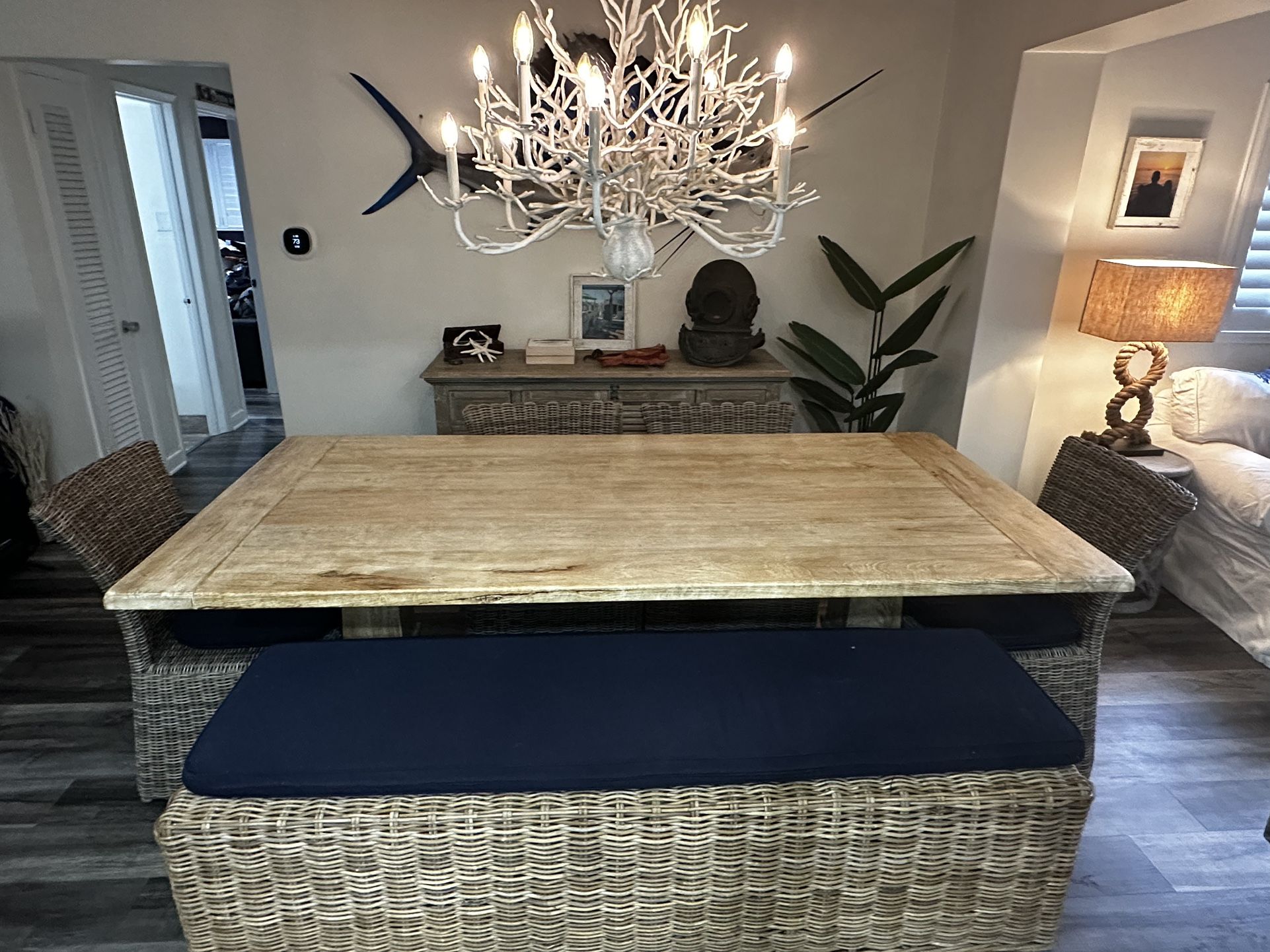 barley used wood dining room table included with price - 4 chairs and 1 bench with navy blue cushions able to negotiate price