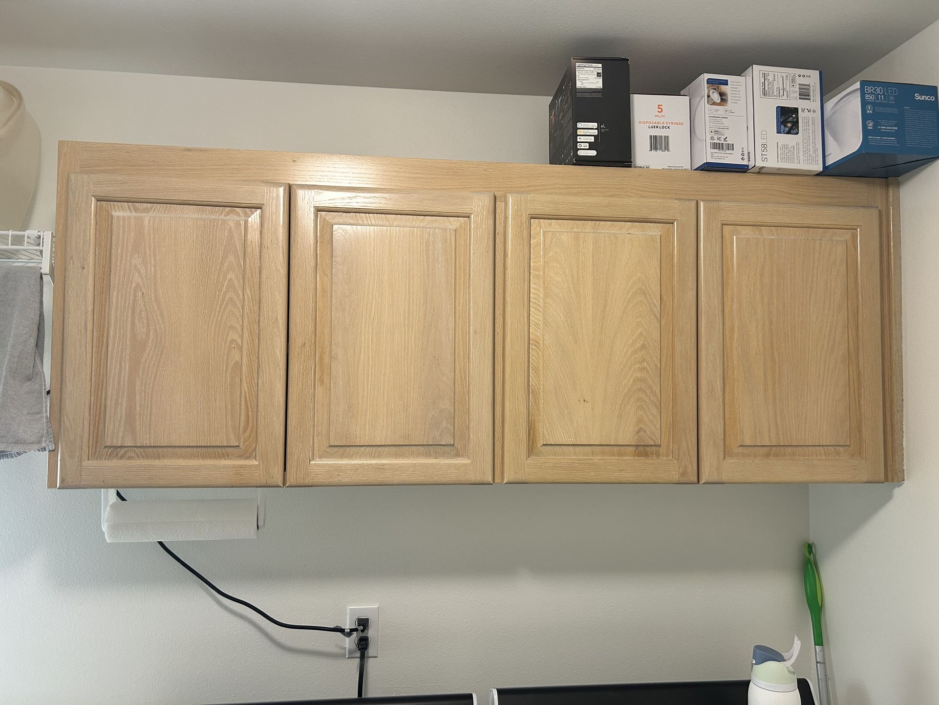 Cabinets door are solid wood and the box are wood veneer. White oak finish. No water damage signal. No yellow water stain on the cabinet or box. Excellent condition- welcome to check it on site. If you choose uninstall it yourself you have to pay first. If you choose to let us uninstall you need to pick it up until end of Feb. Dimension 24 H * 62 L ( two total) * 12 D