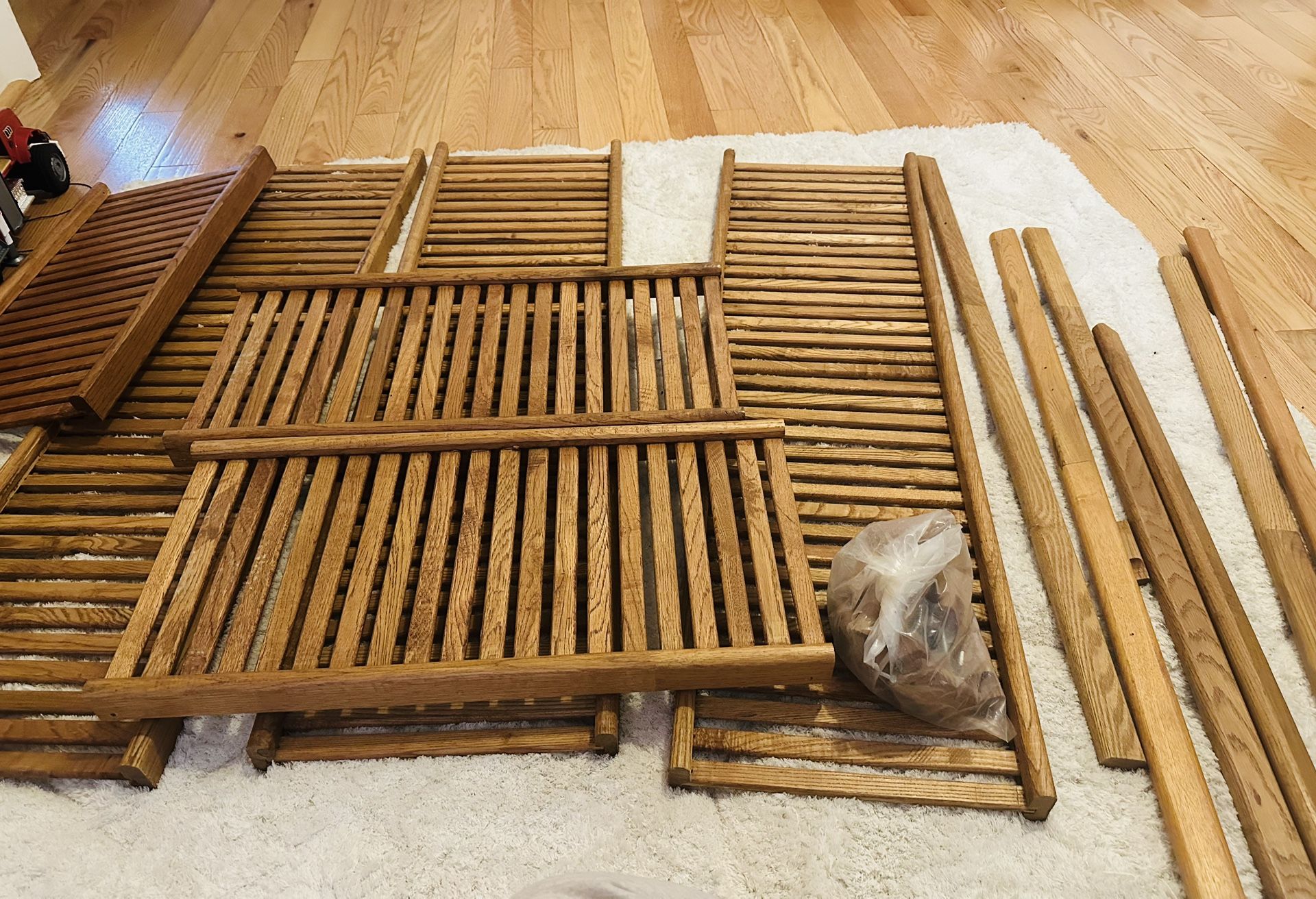 Vintage Lee/Rowan Solid Oak Wardrobe Organizer Fits closets 5 to 9 feet wide Model from the classic Lee/Rowan closet system line. Genuine solid oak – very sturdy, high-quality wood. The set is new and never installed. All shelves, wooden uprights, rods and hardware are included. Original paper instructions are missing, but the unit is complete and unused. Includes: • 3 large solid oak shelves (slatted style) • 3 small shelves And etc This organizer creates a full closet system with: • Double hanging section • Long hanging section • Multi-shelf storage tower Perfect for someone who likes vintage quality closet systems or woodworking projects. New old stock. Never assembled. Pickup only.