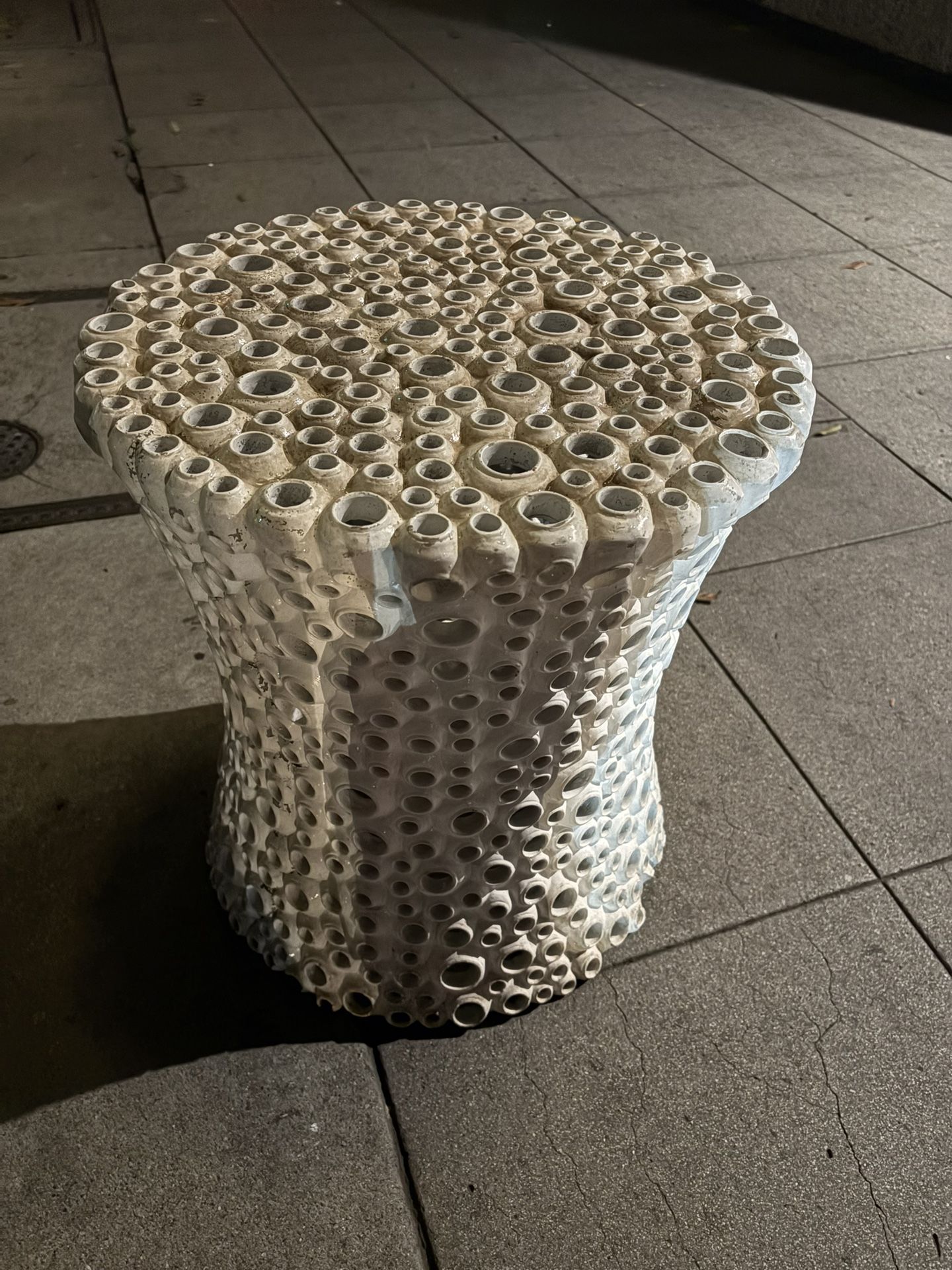 Meri Side Table – Pierced Resin Glow Beast Handcrafted pierced white cast resin (straight outta Oly Studio vibes—official one’s $1,850 new). 18” diameter x 20” tall. Rescued from DTLA streets, power-washed, touched up with white spray, now looks fresh as fuck. Lights up insane—pop a small LED (bike light works perfect) underneath and it glows every color like a mini rave. Holes are perfect for hiding strips—no mods needed. Street-sourced, gallery-polished, zero bullshit. $700 OBO. Serious buyers hit me up—pickup downtown LA.