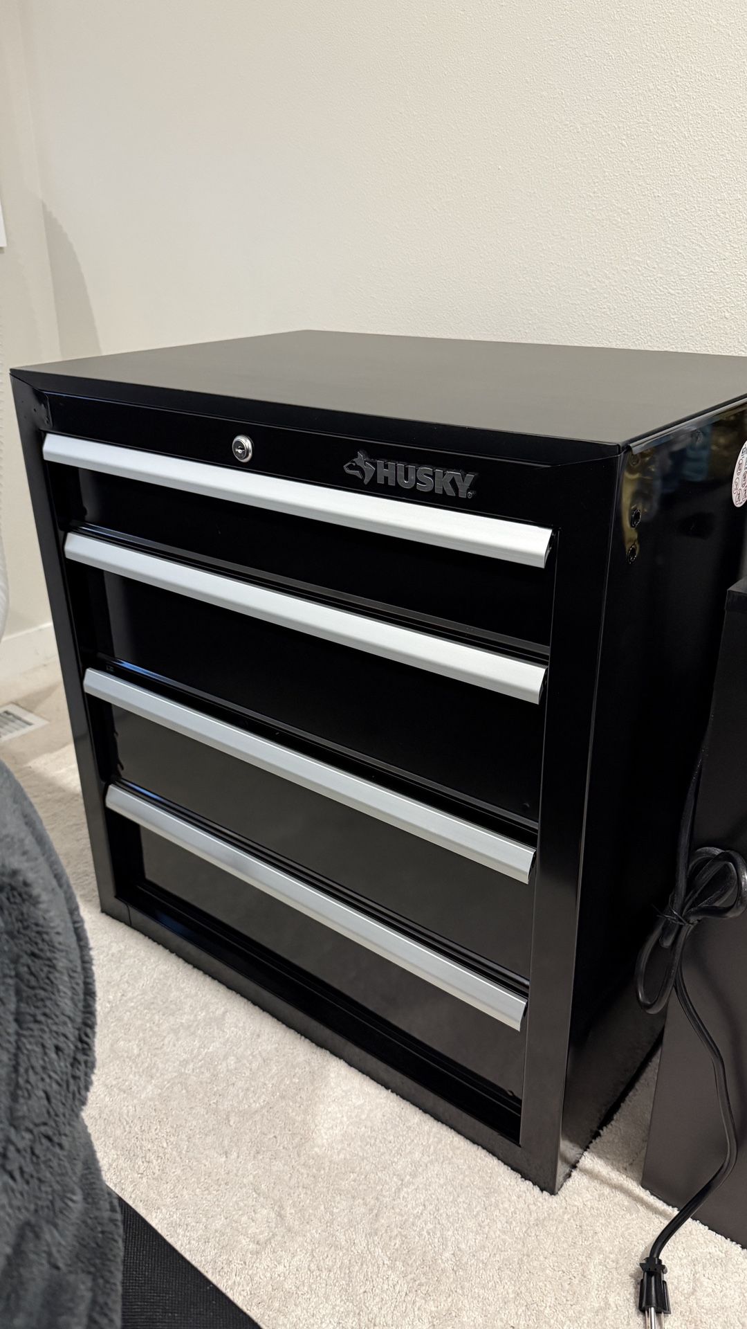 200$ for a husky tool chest 27 inch model. No dents n scratches very good condition. I have the wheels and side handle still just not installed. Wrapped the top wooden part in Matt black.
