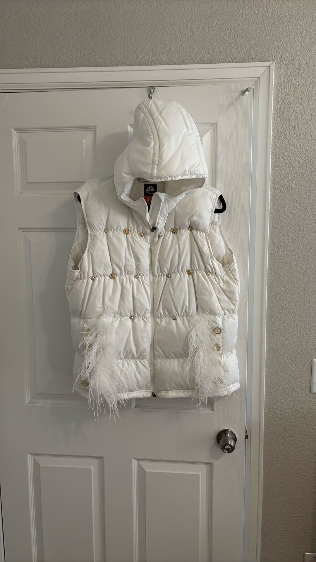 This custom redesigned puffer vest with hood is amazing!! Perfect for over a turtleneck or on the slopes The bling and accessories that have been custom-made shows the uniqueness and beauty! Grab this before it goes. Thx for supporting!