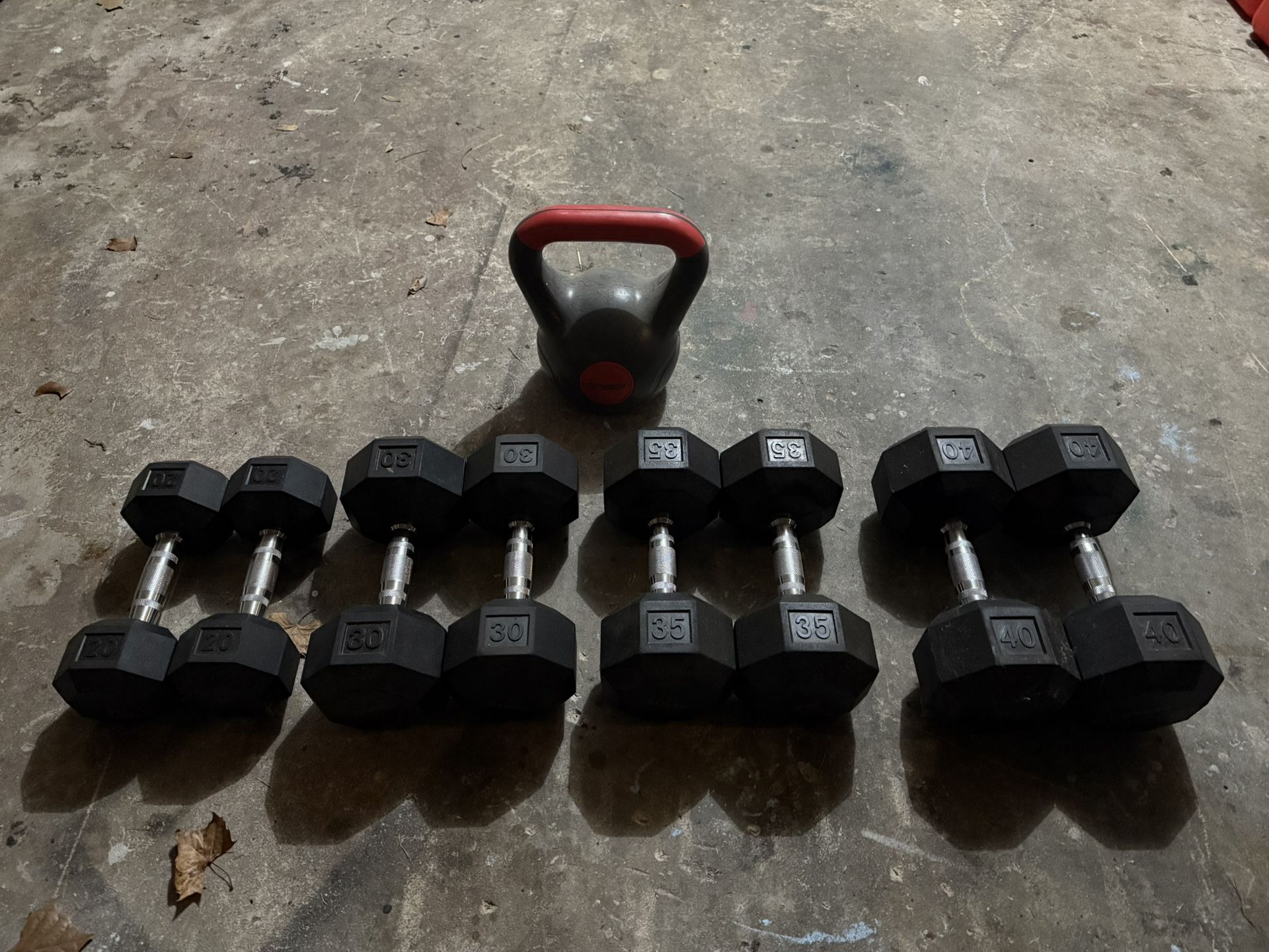 Bought from target a little over a year ago. Don’t use them anymore. 2 of each (40, 35, 30, 25, 20) Plus 20 pound kettlebell. Pair of 25s not in picture but are same brand.