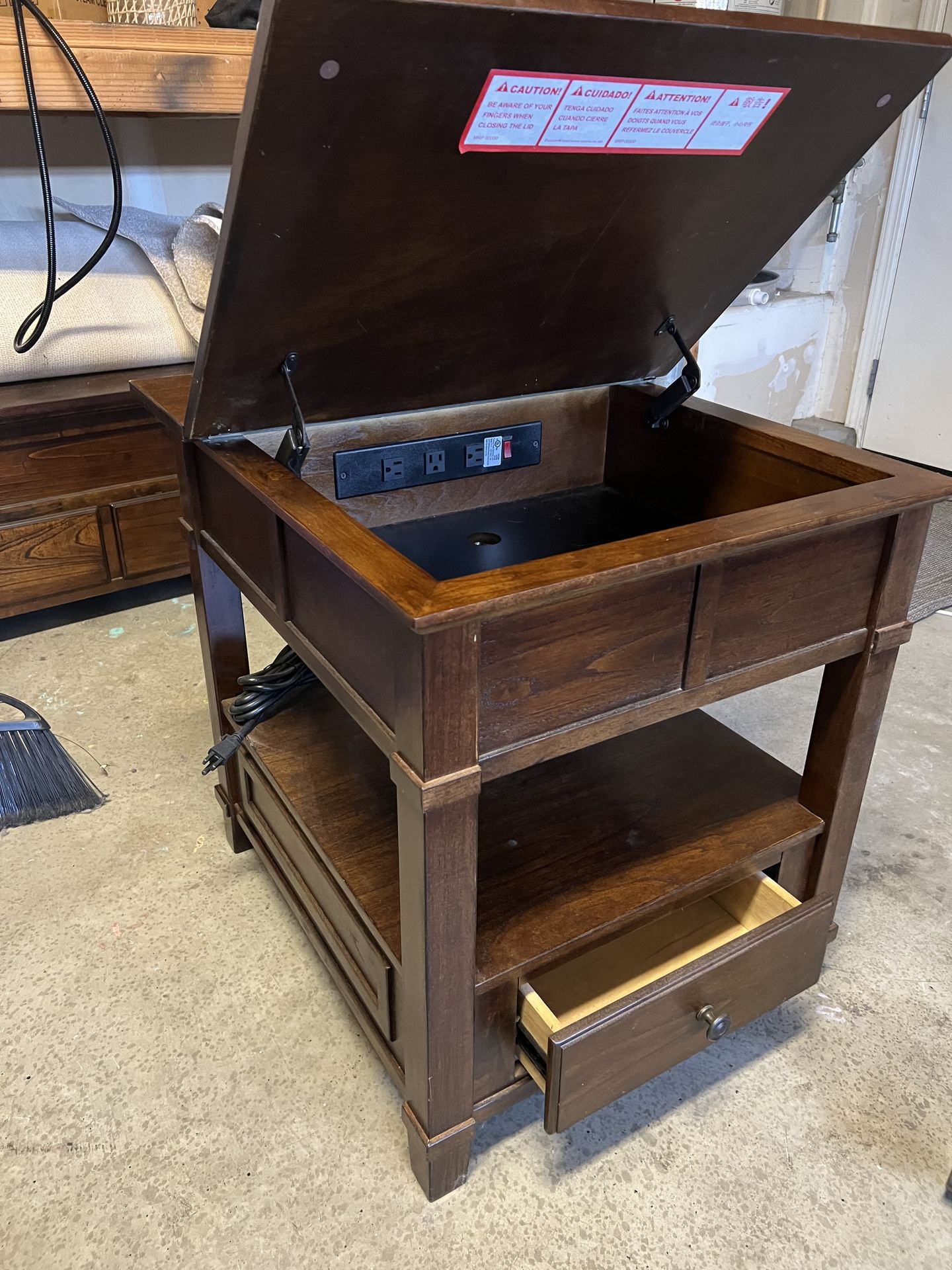 Minor wear and tear. Side table had electrical outlets. Coffee table raises and swings toward you for dining in front of TV. Cash or Venmo only. You pick up.