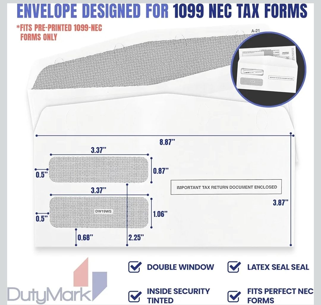 DutyMark DW19WS Double Window Security Envelopes 1099 NEC W2 Gum Seal 100pk