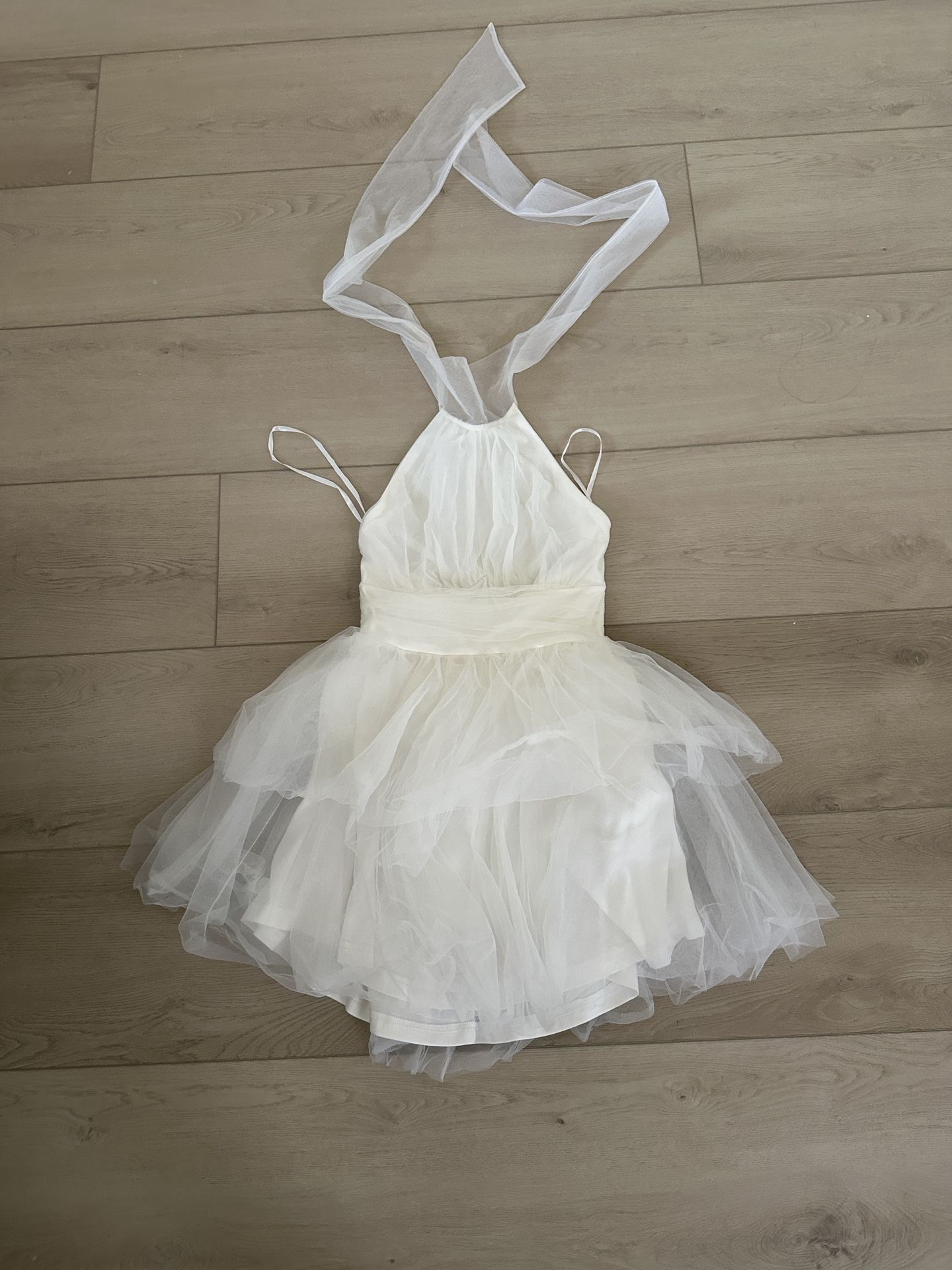 Here comes the sun white dress from selfie Leslie. It’s the Andria halter neck tulle mini dress. I only wore it once for my engagement party. Size small, pick up only!