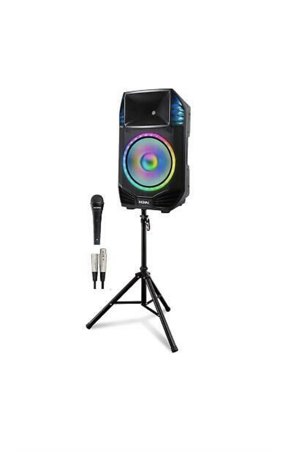 Practically Brand New Used two times -All-in-one high power 500-watt bi-amplified sound system -15” (381mm) woofer and 1” (2.5mm) tweeter for great sound coverage -Woofer glows in multiple colors; lights move in dazzling effect to music -Multi-channel mixer with Master Volume and XLR inputs -Separate bass and treble controls for precise tonal adjustment -Dual microphone inputs, microphone and cable included -Echo effect on microphone for great karaoke -1A USB charge port keeps your devices ready to go -Streams music from any Bluetooth device -Voice prompts for easy Bluetooth pairing -Wireless stereo-link connects additional Total -PA Premier FM radio built-in -Wireless remote enables convenient control USB port and SD card slot plays all your digital music files -App-enabled control for audio and lighting functions -1/8-inch and ¼-inch inputs handle any other equipment -Rugged construction with integrated handles and steel speaker grille -Included stand elevates speaker to perfect height -Built-in handles and wheels for easy transport