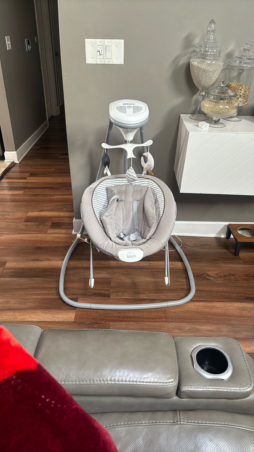 • Soothing Motion: Gentle swaying motion and adjustable swinging speeds • 2-in-1: Swing seat doubles as a portable bouncer with carry handles for use throughout the home • 3 Ways to Swing: Multi-direction seat with adjutable recline pivots to allow baby to swing side-to-side or front-to-back • Seat Recline: Adjustable recline to find just the right angle to keep baby comfortable • Comfort Features: cozy removable body support, soothing 2-speed vibration • Includes: Toy mobile with soft toys, removable machine-washable fabrics, 5-point harness, songs, sounds, and an AC adapter