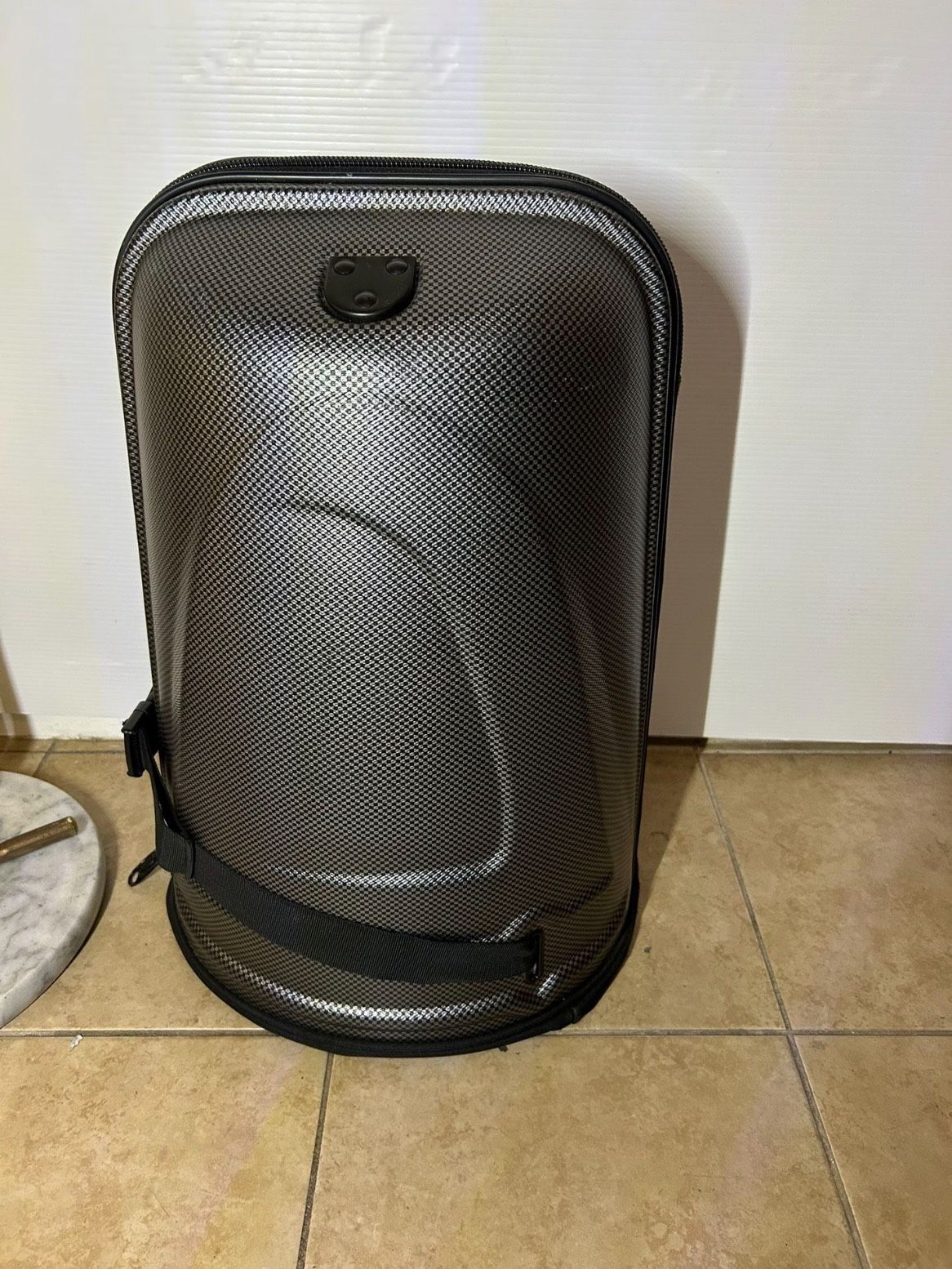 Hard case with 2 wheels Foldable for easy storage Missing top handle of hard case Nothing rip/torn/dent Perfect zipper