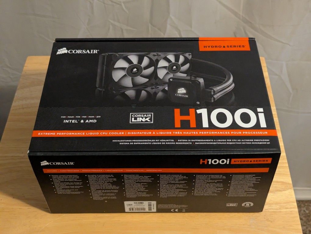 Used, worked when it was removed for upgrade. Original version of the H100i series - Model CW-906009-WW, 240mm radiator (2x 120mm fans). Includes brackets for Intel and AMD CPUs.