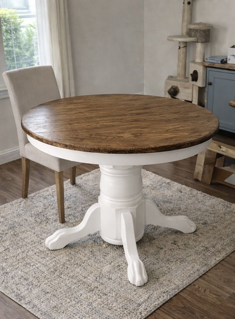 Give your dining space a fresh look with this beautiful, newly refinished pedestal table! This piece features a classic two-tone design with a rich, natural wood-stained top and a clean, soft white painted base. Its timeless farmhouse style fits perfectly in eat-in kitchens or small dining areas. Excellent, like-new condition after being professionally refinished. Please note: The table is missing one decorative wood piece (see photos), but it is otherwise structurally sound and ready for use!