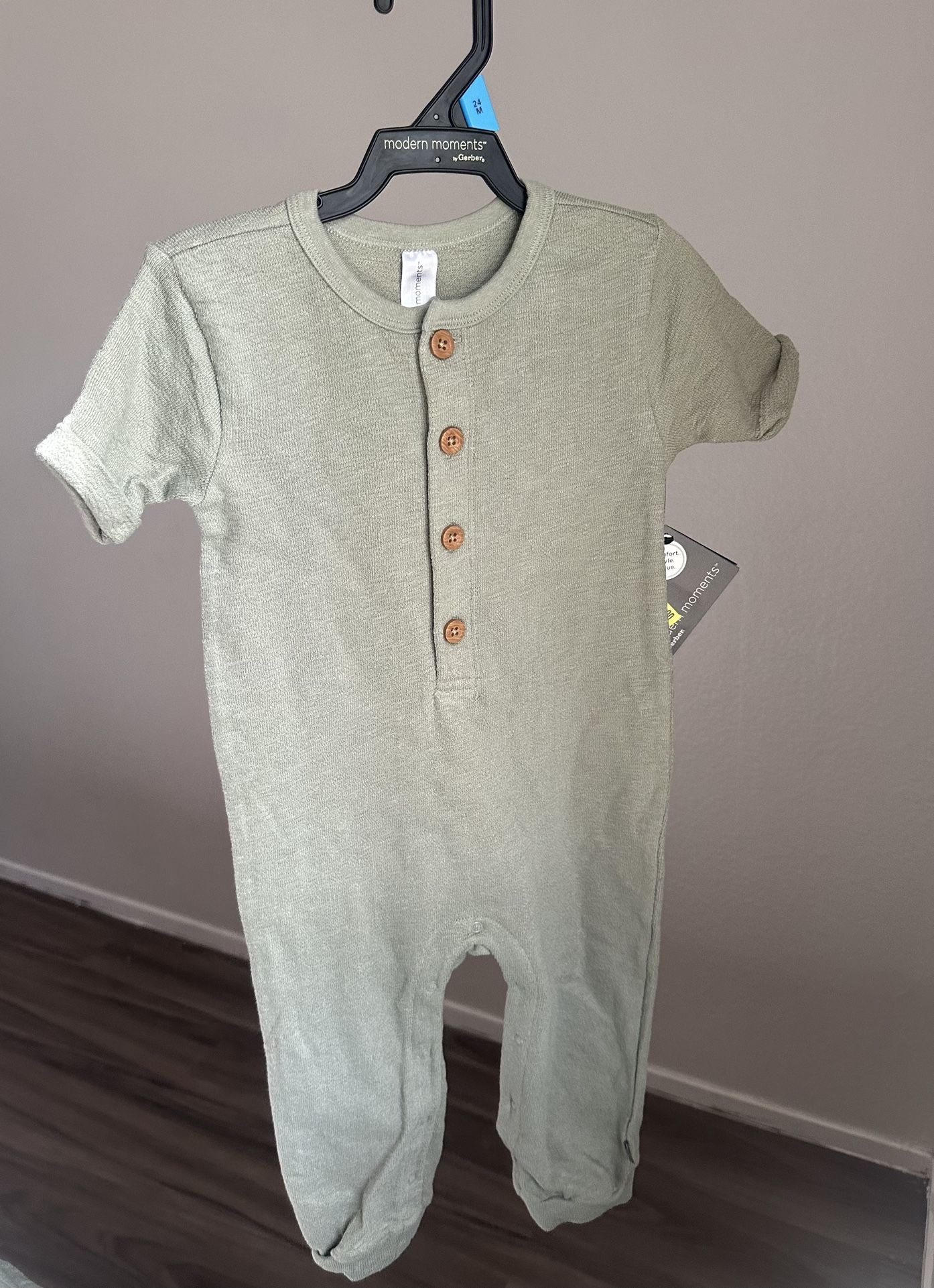 Condition: Brand new with tags Size: 24 months Smoke-free, pet-free home Soft and stylish sage green baby romper from Modern Moments by Gerber. Features short sleeves, full-length legs with footies, and a wooden button-front detail. Made from a breathable, comfy fabric perfect for everyday wear.
