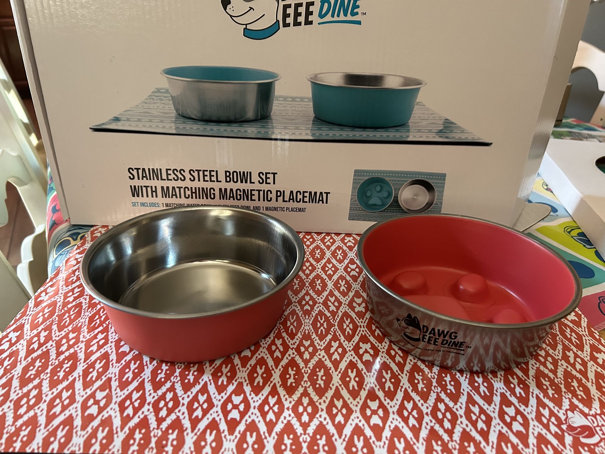 Adorable, stainless steel dog water and food bowls with magnetic mat so the bowls don’t move around while the dog is eating.