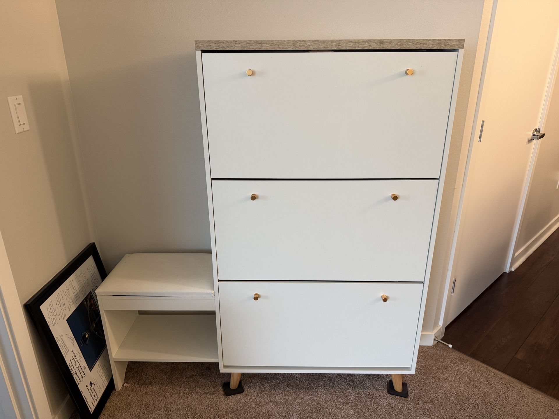 Modern Entryway Shoe Cabinet with Bench. Modern white shoe cabinet with 3 flip-down drawers and a built-in bench seat on the side. Each drawer has adjustable racks that hold multiple pairs of shoes while keeping them hidden and organized. Great for entryways, hallways, or small spaces. The side bench is perfect for sitting while putting shoes on, and the open shelf underneath can store bags, baskets, or additional shoes. Approximately 4 ft 7 inches high, 1 foot wide (front to back when closed), 1 ft 8 inches wide (with drawers open), and 4 ft 2 inches long. Located in Juanita Neighborhood in Kirkland. You will need to pick up. I live in 3rd floor WITH elevator access.