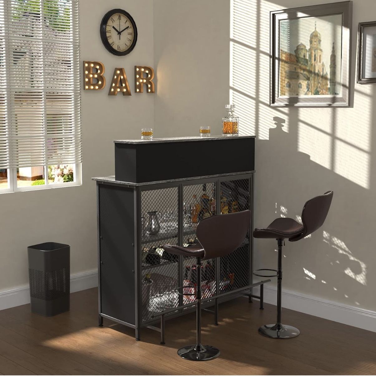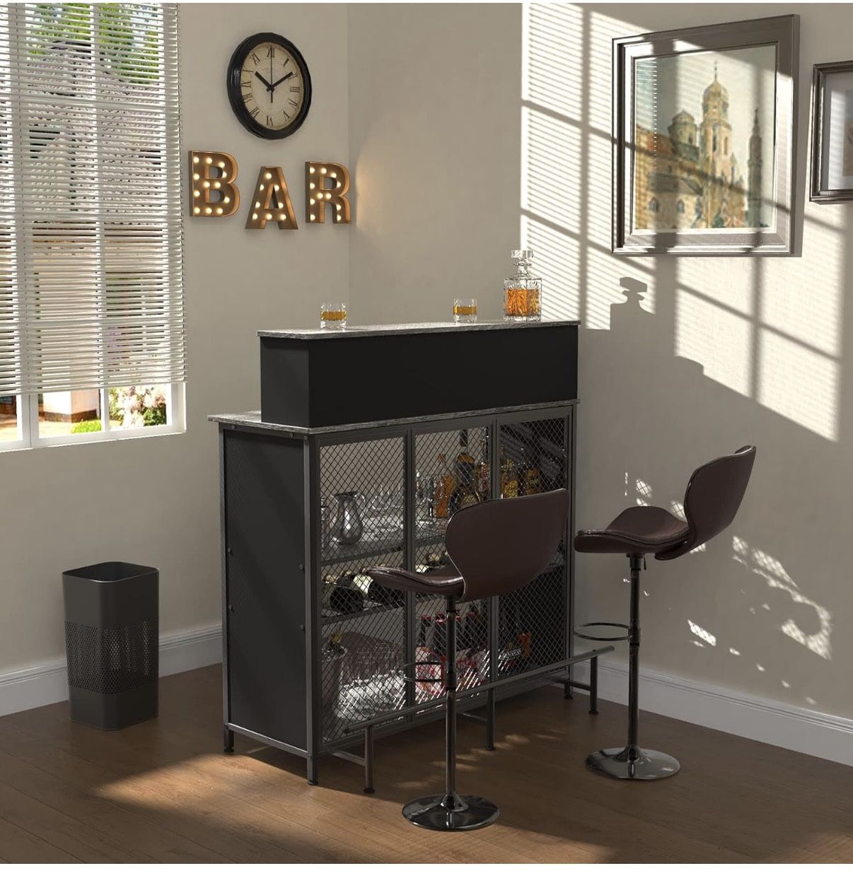 I absolutely LOVE this bar. I just went in a different direction with my decor. The specifications are below. It has a sturdy wine rack, has a specified space to store wine glasses, and just over all space to give a real bar vibe. I bought a couple bar mats for it, so you’re free to have those. You must have help carrying the bar. It’s quite heavy.