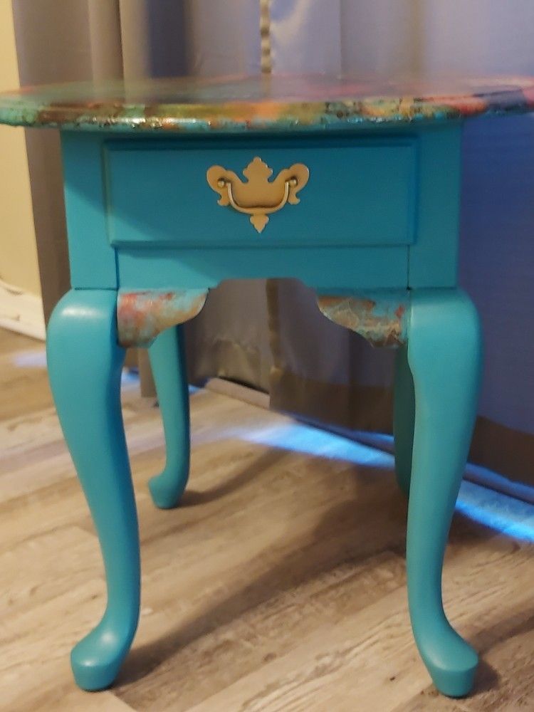 From Frumpy to Fabulous, this table has colors to bring life to a dull space or add to your colorful life. One small drawer. Solid wood, Broyhill. 23x27x23 H Oval. Teal. Cash only please.