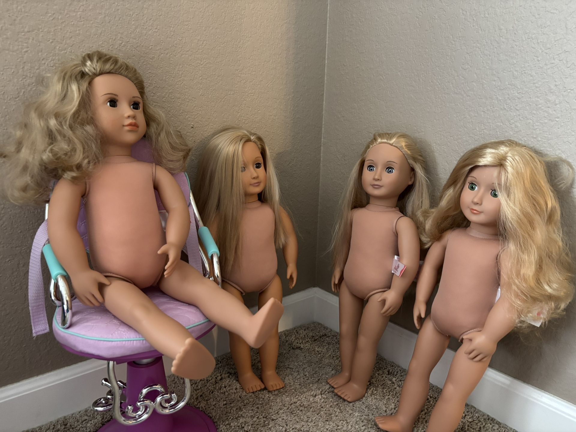 Four very good condition Our Generation Doll. Chair. Bed. Clothes.