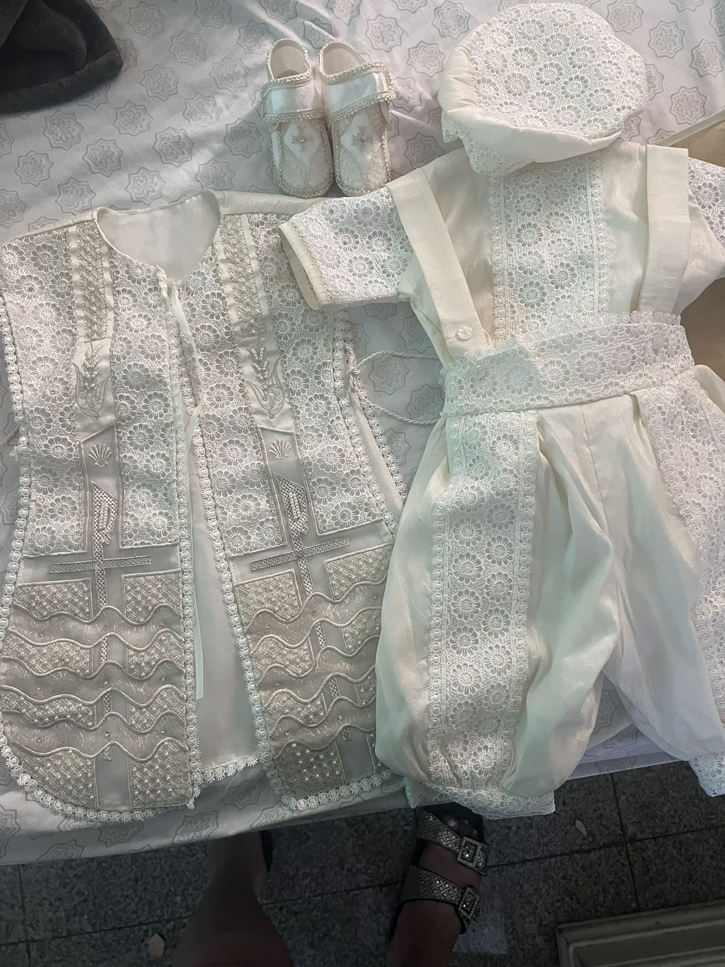 Ropon de bautizo para niño Size: 1T le queda a un bebé de 8 meses a 1 año Viene con zapatitos gorra y ropita interior