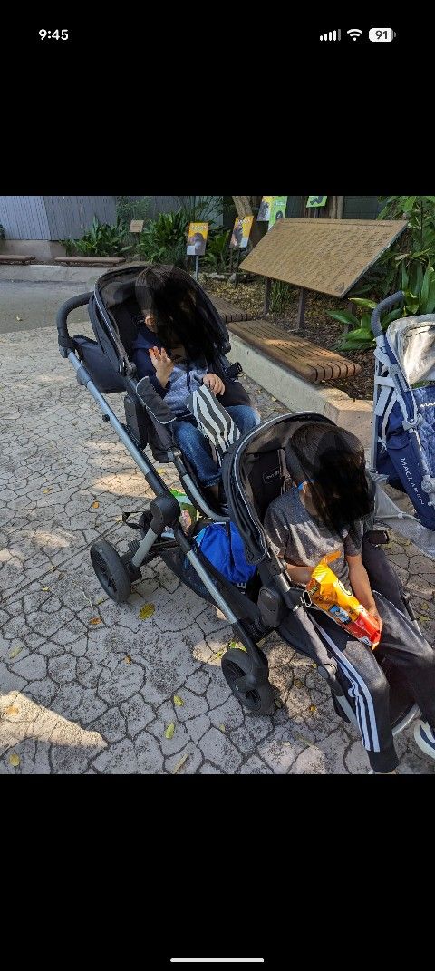 Well loved and outgrown. Includes two seats, a travel bag and one rain cover for one seat. Been in the garage a while so needs to be wiped down, but has lots of life left. The clip to lock it closed broke off, but it does not affect the safety or ride, you just have to fold it and carry it closed to put away in trunk.
