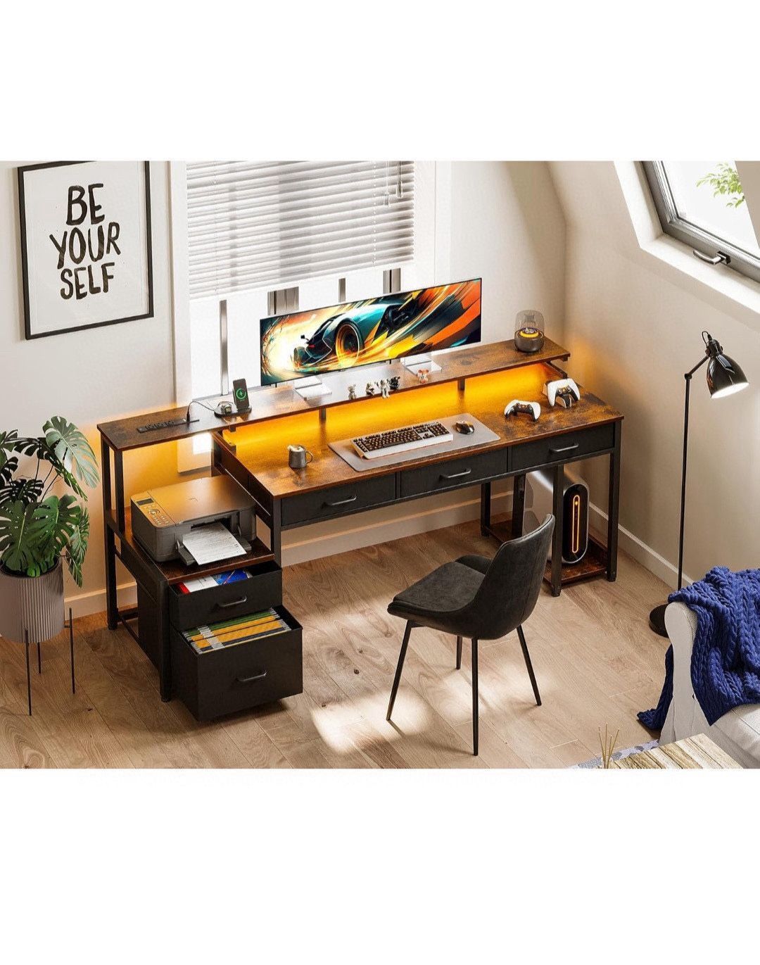 DK160 $60 55 Inch Computer Desk with 3 Drawers and File Cabinet for Storage, Office Desk with Monitor Stand and LED Lights, Home Office Desks, Vintage Ample Storage Space】The office desk with storage offers ample storage solutions, including 3 drawrs, 2 file drawers, a printer cabinet, a 2-tier under bookshelf and a computer tower stand. With these features, you can easily keep your items organized and within reach. 【Customizable Ambient Lighting】: Set the mood with built-in LED strip lighting. Whether you're working late into the night or simply want to add ambiance to your workspace, the adjustable LED strip provides customizable lighting options to suit your preferences, enhancing both functionality and aesthetics. 【Convenient Charging & Monitor Stand】:The computer desk with power outlet features 3 standard plug outlets and 2 USB ports, providing convenient charging for your laptop, phone and gaming devices. The long monitor stand protects your neck and spine health and also creates extra storage space for your items. 【Extra Large Desktop & High Stability】: The length of our main desktop is 39.4", which is larger than other common desk. The wide desktop of the computer desk provides enough space to place your items. Built with a sturdy metal frame and high-quality MDF board to ensure a long-lasting usage. 【Easy Assembly & After-sale Service】With manual illustrated and parts numbered, we also offer assembly video on the product page for you to put the office desk together easier. b011411