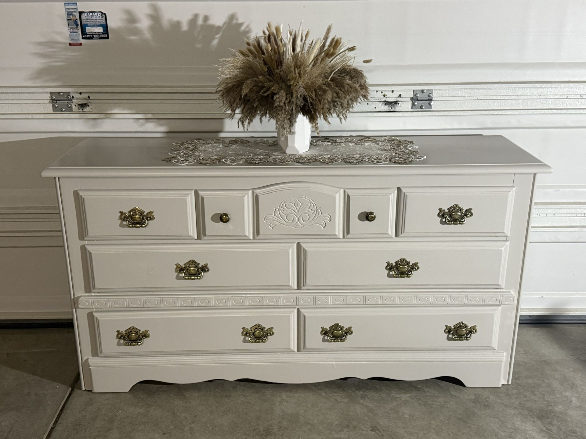 Dresser, with 7 drawers as you can see very beautiful dresser all the drawers works perfectly fine nothing is broken. I have all the measurements you’re looking for in the pictures swipe right you’ll see it and for the color it is light gray and the handles is dark and gold. And to make it easier for you. I can also deliver it to you anywhere anytime. Ask me about the delivery info