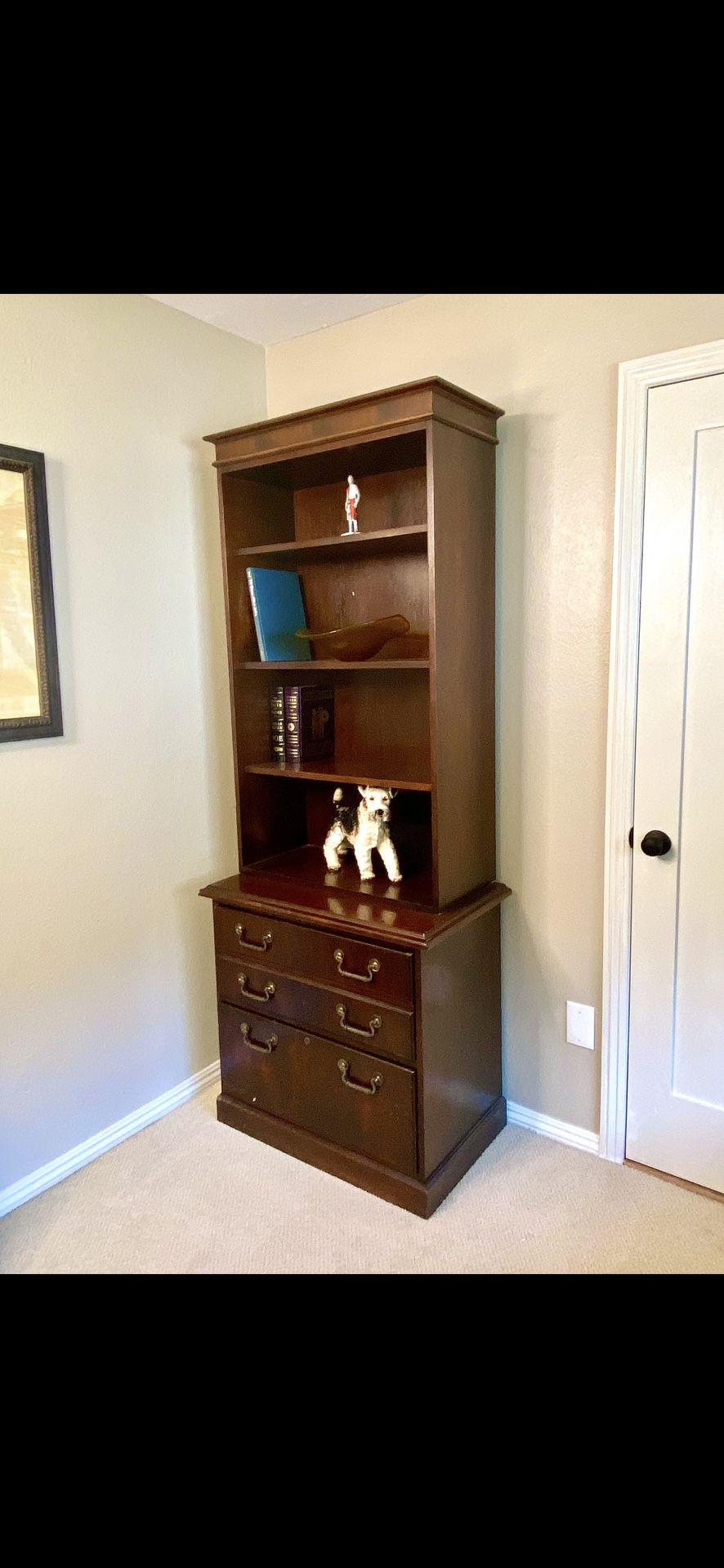 1970s two piece solid wood cabinet with bottom drawer is file holder base is 32 inches wide by 29 inches deep total height 80 inches solid wood