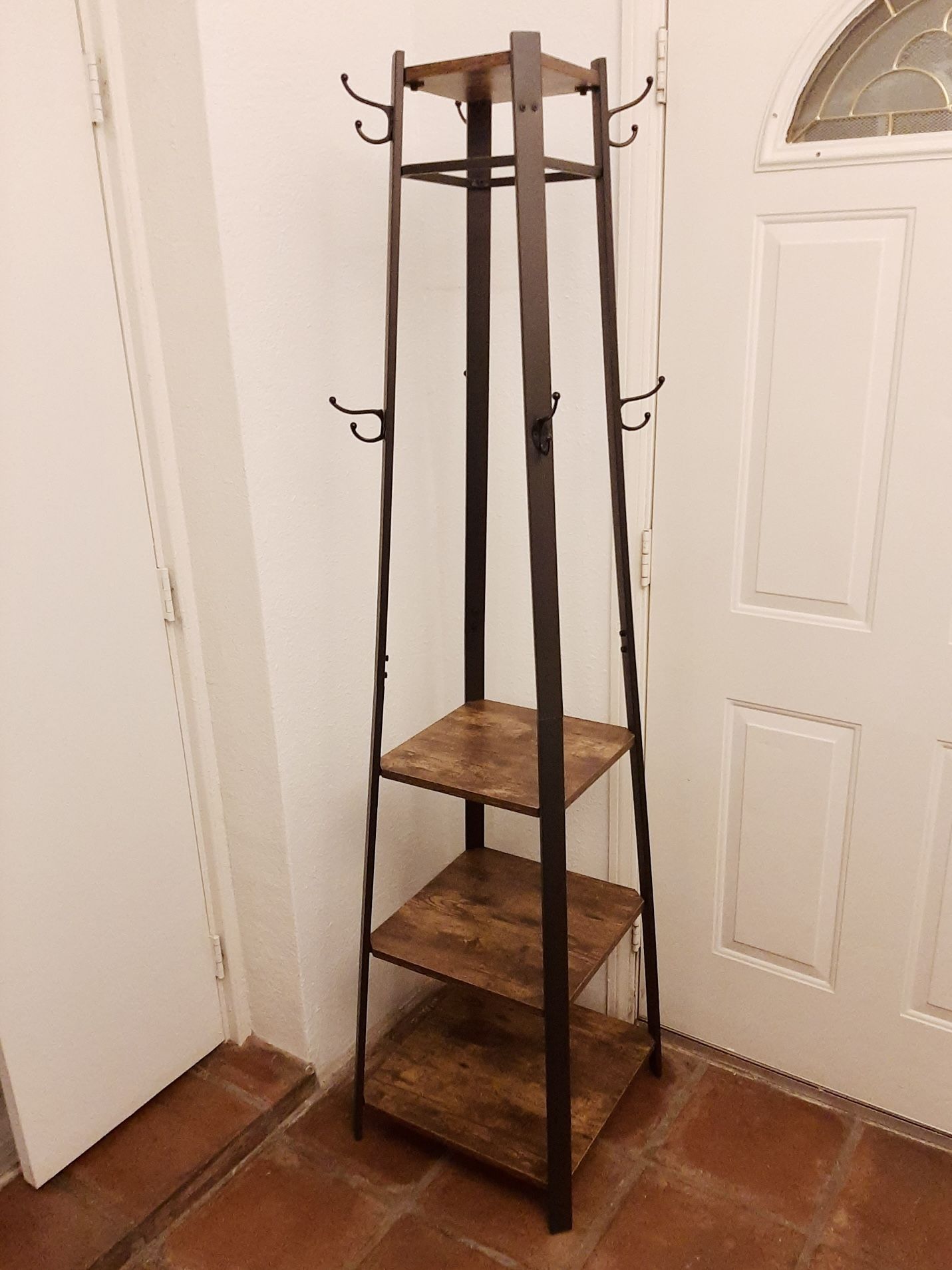 Particleboard/steel coat rack with industrial style. 3 tiers of differently sized rustic brown shelves and slightly tapered black steel legs. Size dimensions on 2nd photo. Coronado neighborhood (13th street and McDowell)